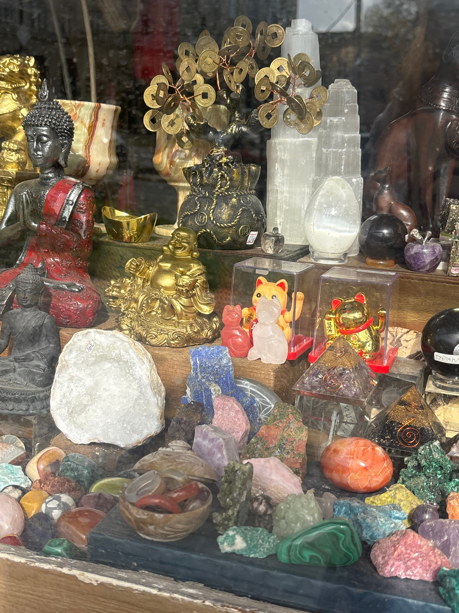 The image shows a display of various objects in a shop in Varna, Bulgaria. Prominently featured are several Buddha statues in different colors (gold, black, red), a money tree with metal coins, and se…read more