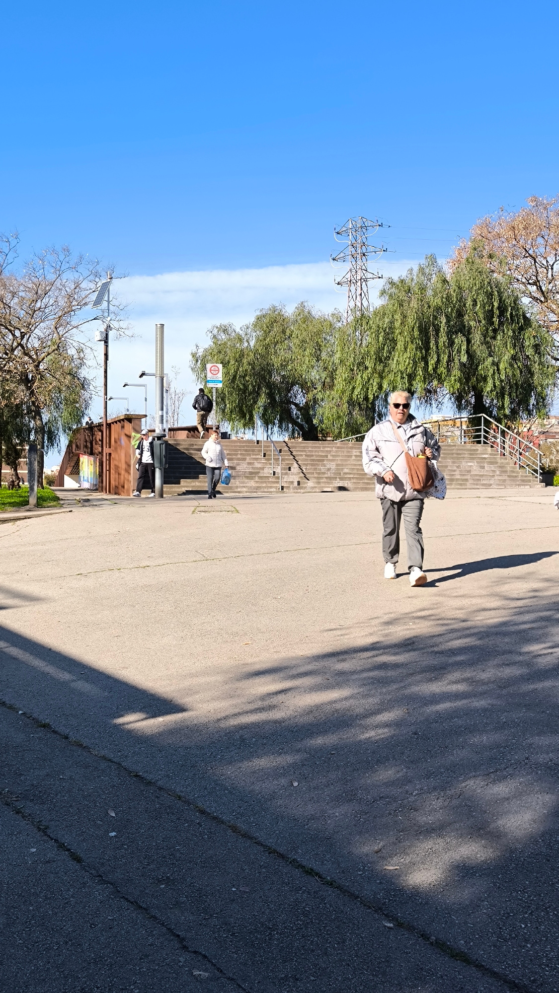The image depicts an outdoor scene in Ripollet, Spain. In the foreground, an elderly person with short blonde hair, wearing sunglasses, a light jacket, dark trousers, and white shoes is walking toward…read more