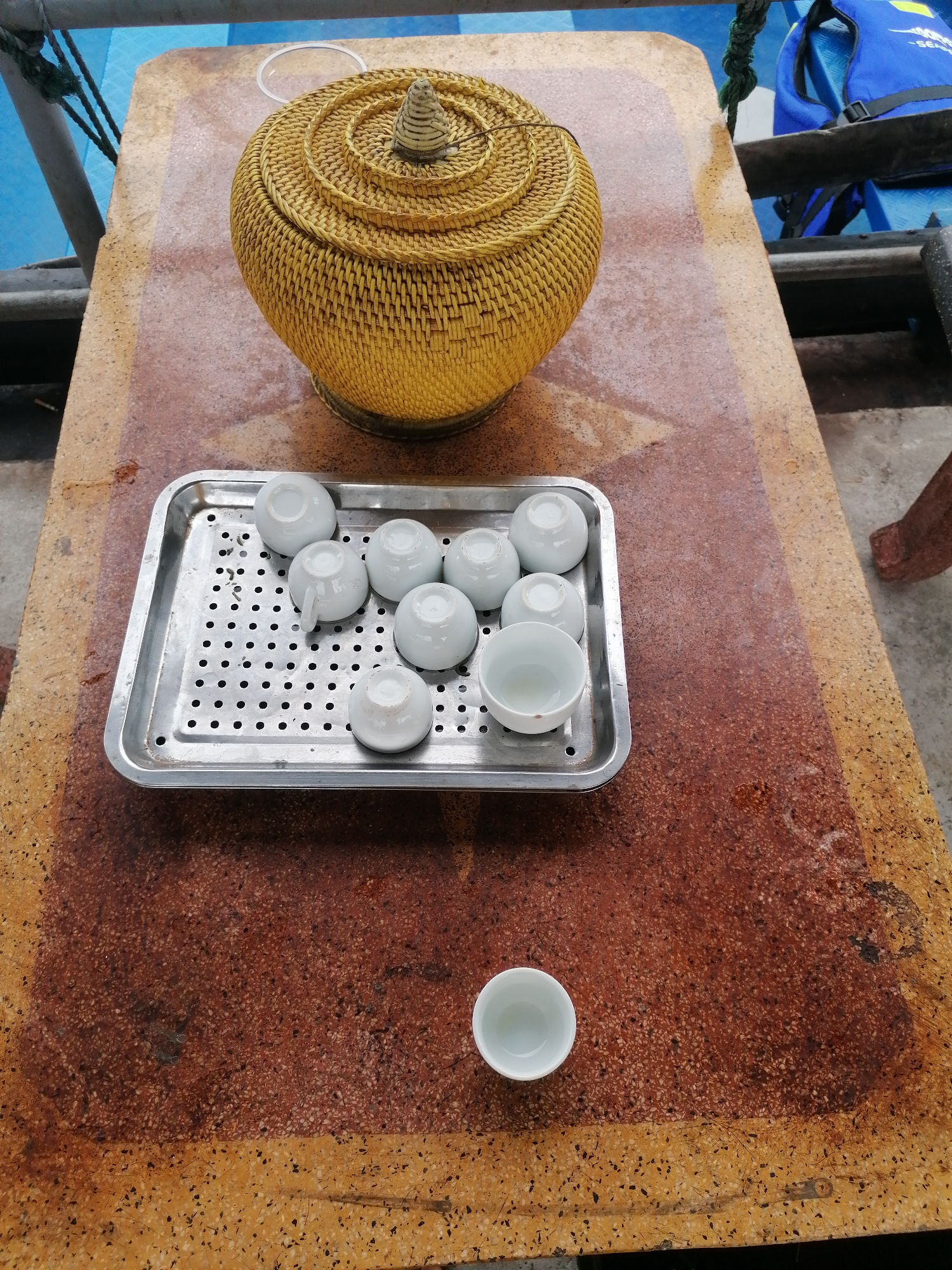 The image presents a top-down view of a rustic table, likely on a boat given the surrounding elements. The table surface is a mottled reddish-brown, speckled with lighter and darker particles, and app…read more