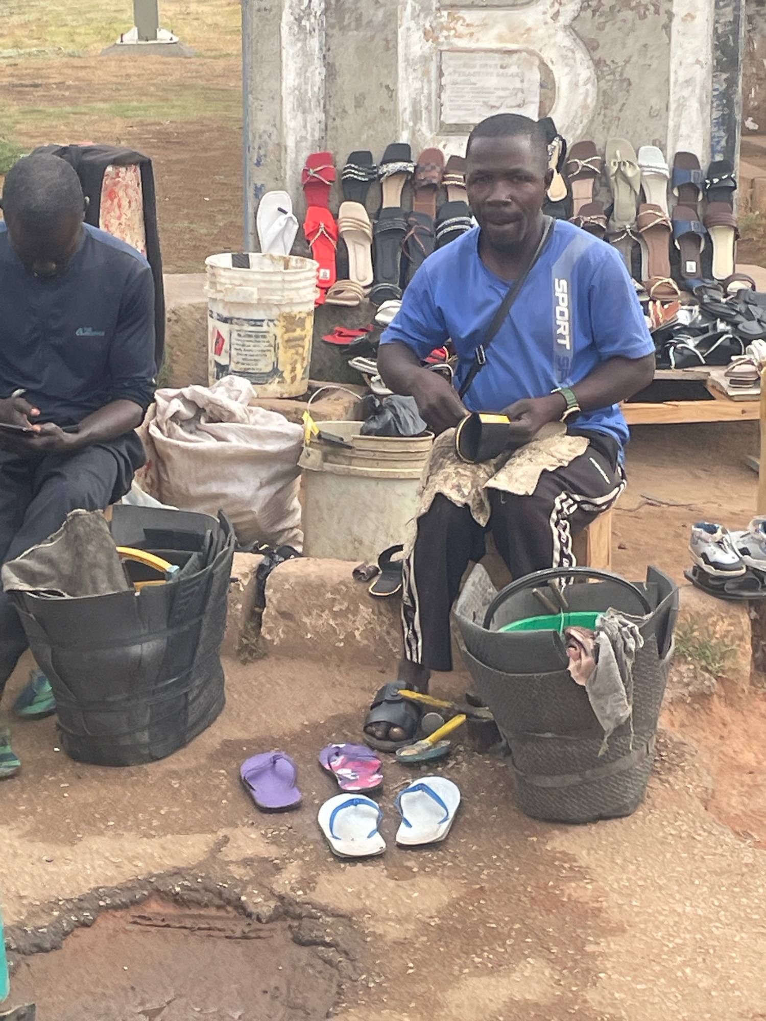 The image shows two men seated in an outdoor setting, likely a marketplace. One man wears a blue "Sport Sport" t-shirt and dark pants with a white stripe. He sits amidst a display of sandals and footw…read more