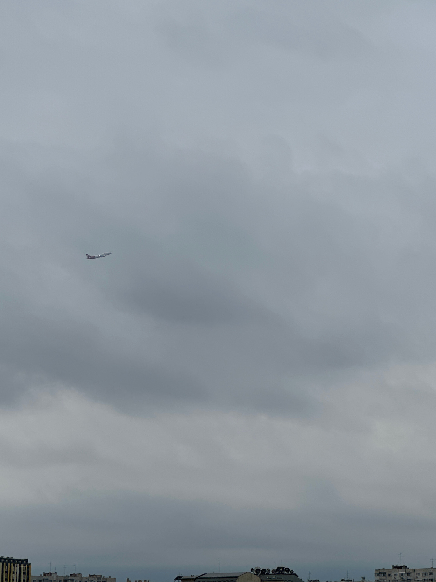 The image depicts a grayish, overcast sky over the city of Sofia, Bulgaria. Buildings are visible on the right edge of the frame. In the lower left quadrant of the image, a small, indistinct object th…read more