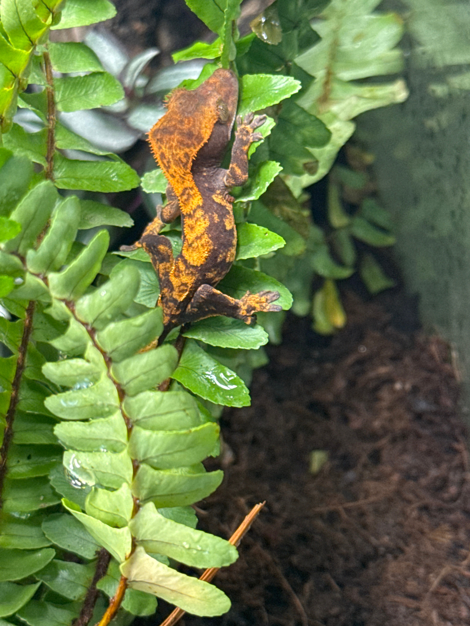 A crested gecko rests on a green fern. The gecko is brown and orange. The environment includes other plants and dark soil in the background. There is no indication of location in Targovishte, Bulgaria. | Open Wire