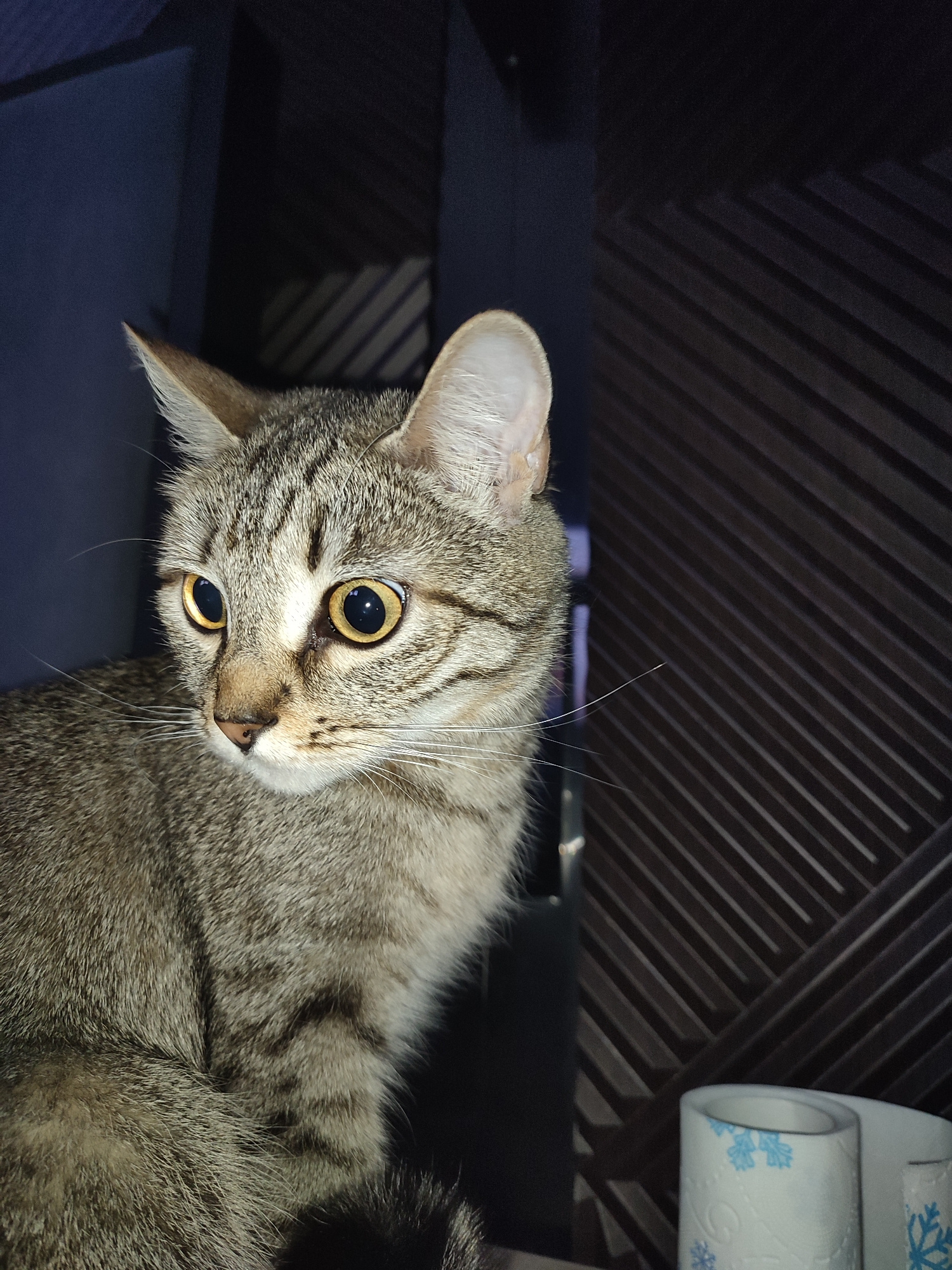 A close-up shot features a tabby cat with golden eyes, a grayish-brown coat, and distinctive stripes on its face and body. The cat is looking slightly to the left of the frame. The background includes…read more