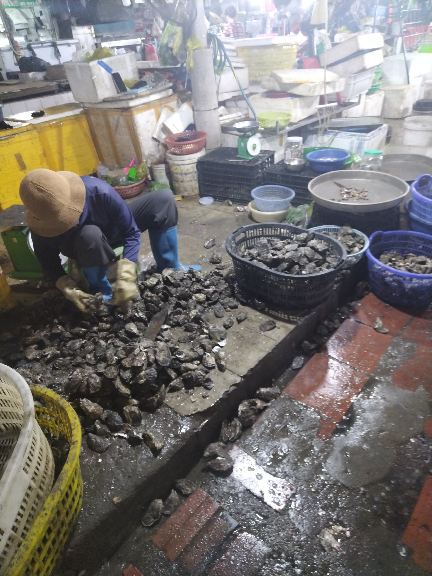 An individual in a blue shirt, dark pants, blue boots, a tan hat, and tan gloves is shucking oysters at a fish market. The individual is surrounded by a pile of oysters, baskets of oysters, and basins…read more