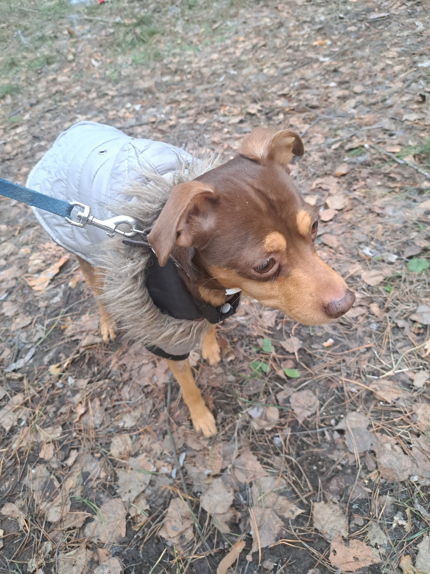 This image captures a high-angle, close-up view of a brown dog standing on a forest floor in what appears to be Chaikovsky, Russia. The dog, which has smooth, short brown fur with lighter tan markings…read more