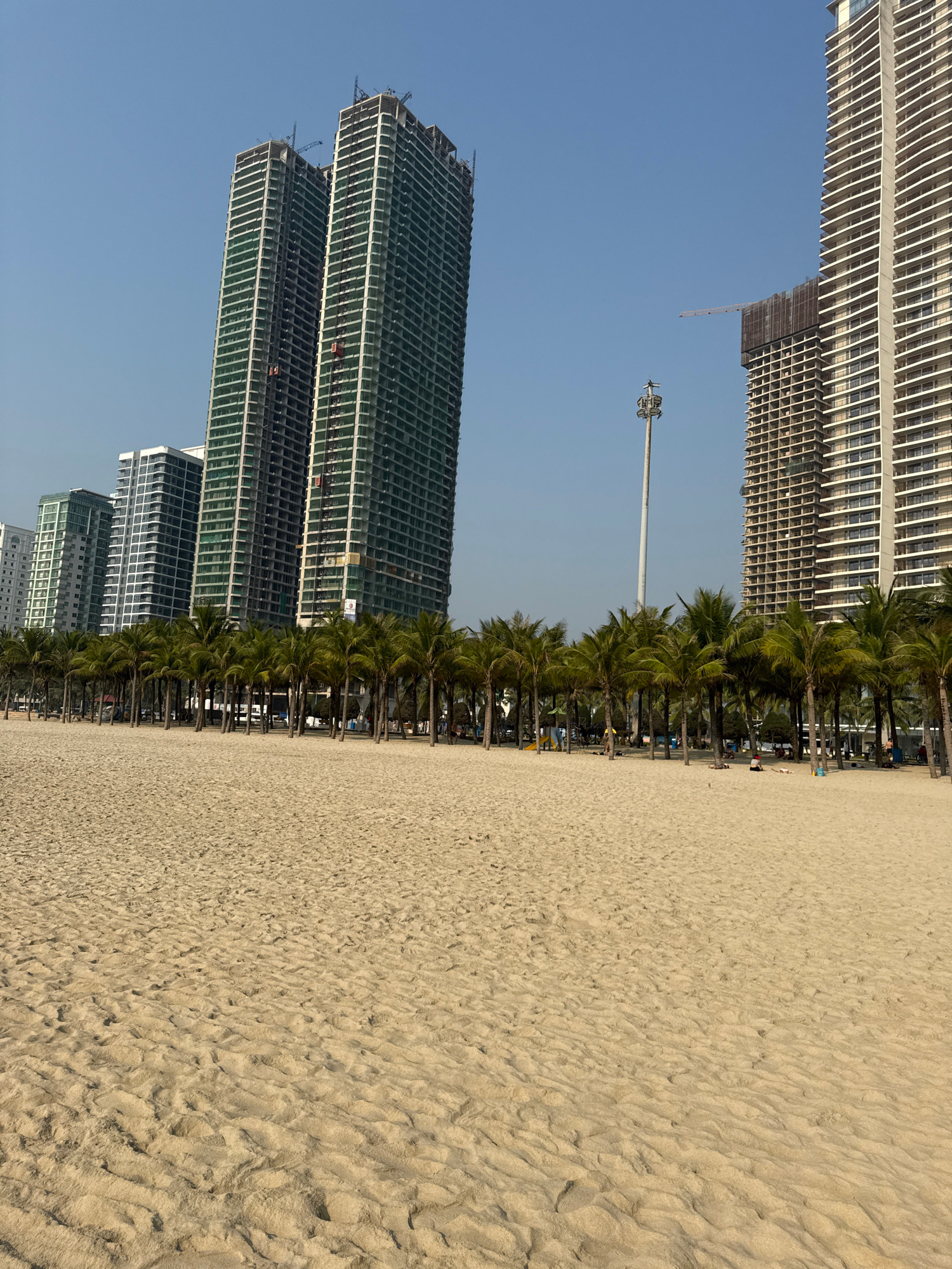 The image depicts a beach scene in Đà Nẵng, Vietnam, with a row of palm trees separating the sandy beach from the cityscape. Several tall buildings stand behind the trees, some under construction. The…read more