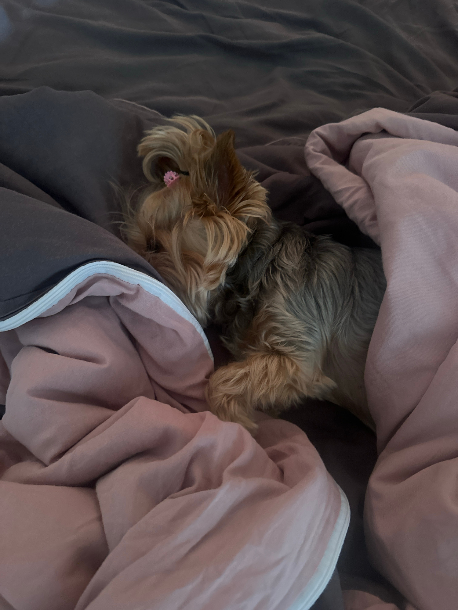 A small dog with long, tan fur is nestled amongst folded bedding. The bedding consists of grey and mauve-colored fabrics, likely blankets or a duvet. The dog is mostly covered by the bedding, with onl…read more