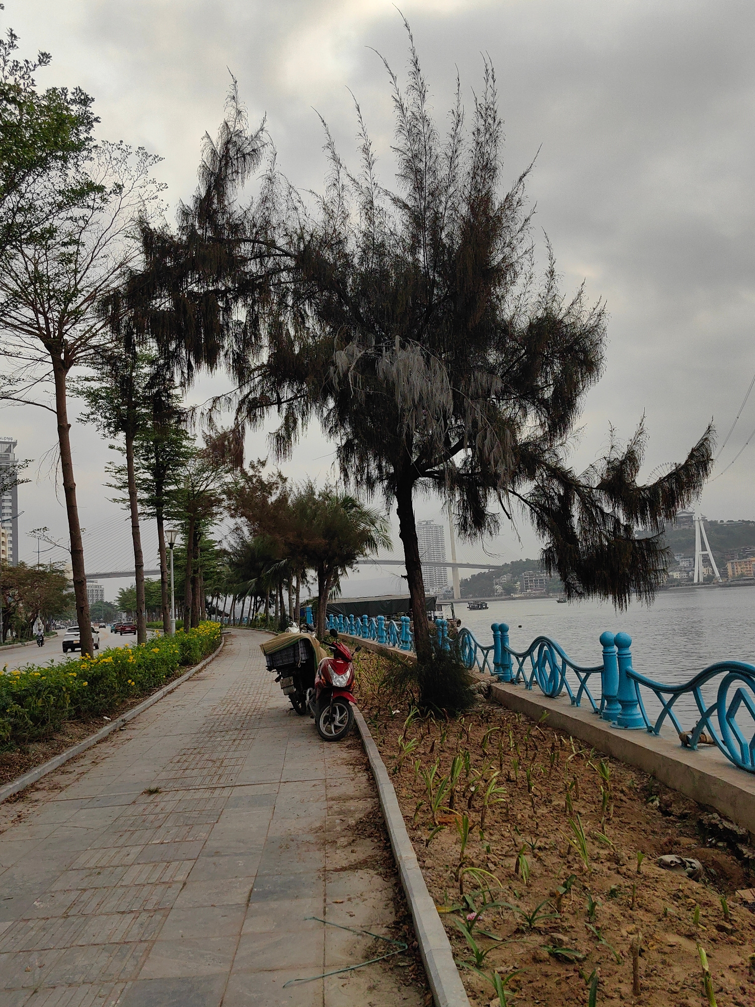 The image captures a cloudy day along the waterfront in Bai Chay Ward, Vietnam. A paved pathway with tactile paving runs alongside a street on one side and a blue, decorative railing separating it fro…read more