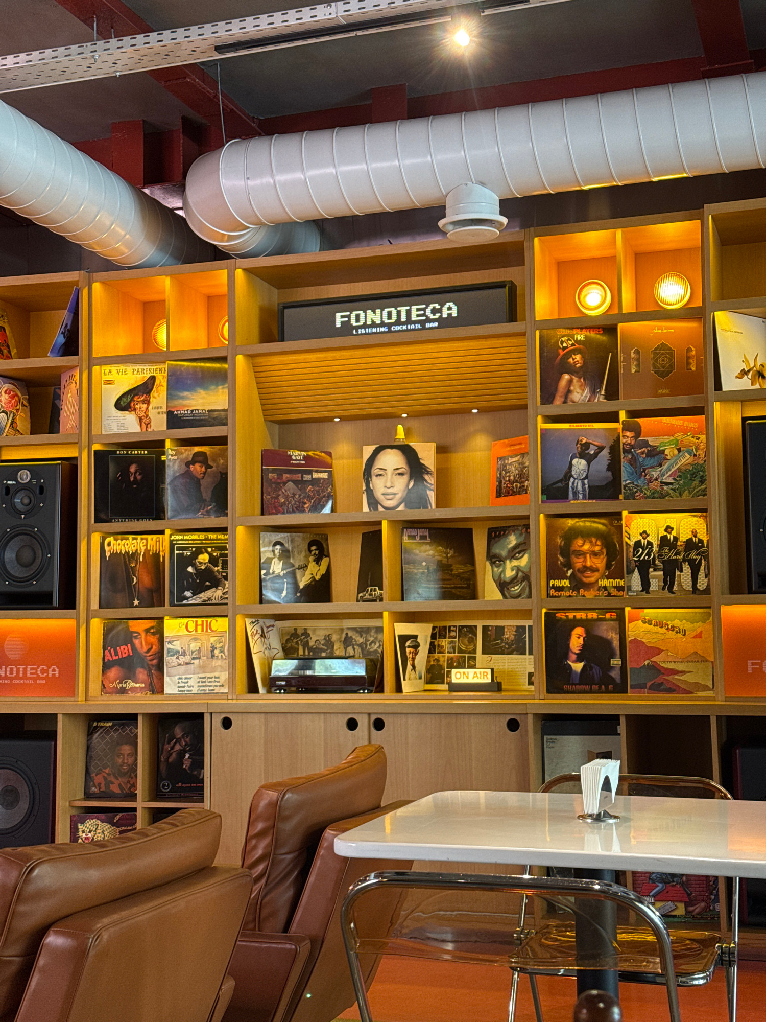 The image displays the interior of a modern listening cocktail bar, likely located in Yerevan, Armenia, characterized by a blend of cozy and industrial design. A prominent feature is a large, custom-b…read more