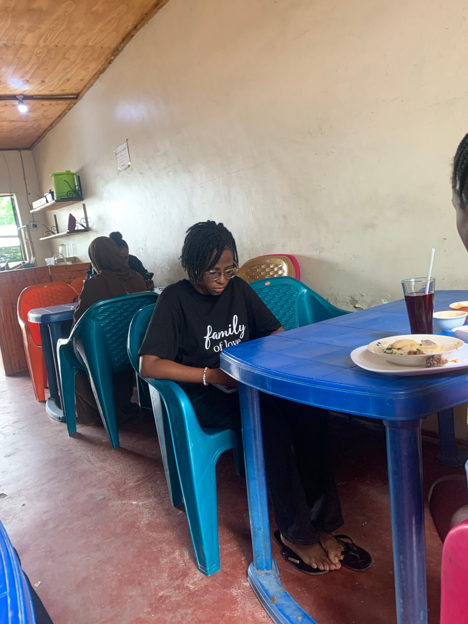 The scene appears to be inside a casual dining establishment in Dar es-Salaam, Tanzania. A young woman with braided hair is seated at a blue plastic table, wearing glasses, a black t-shirt with "Famil…read more