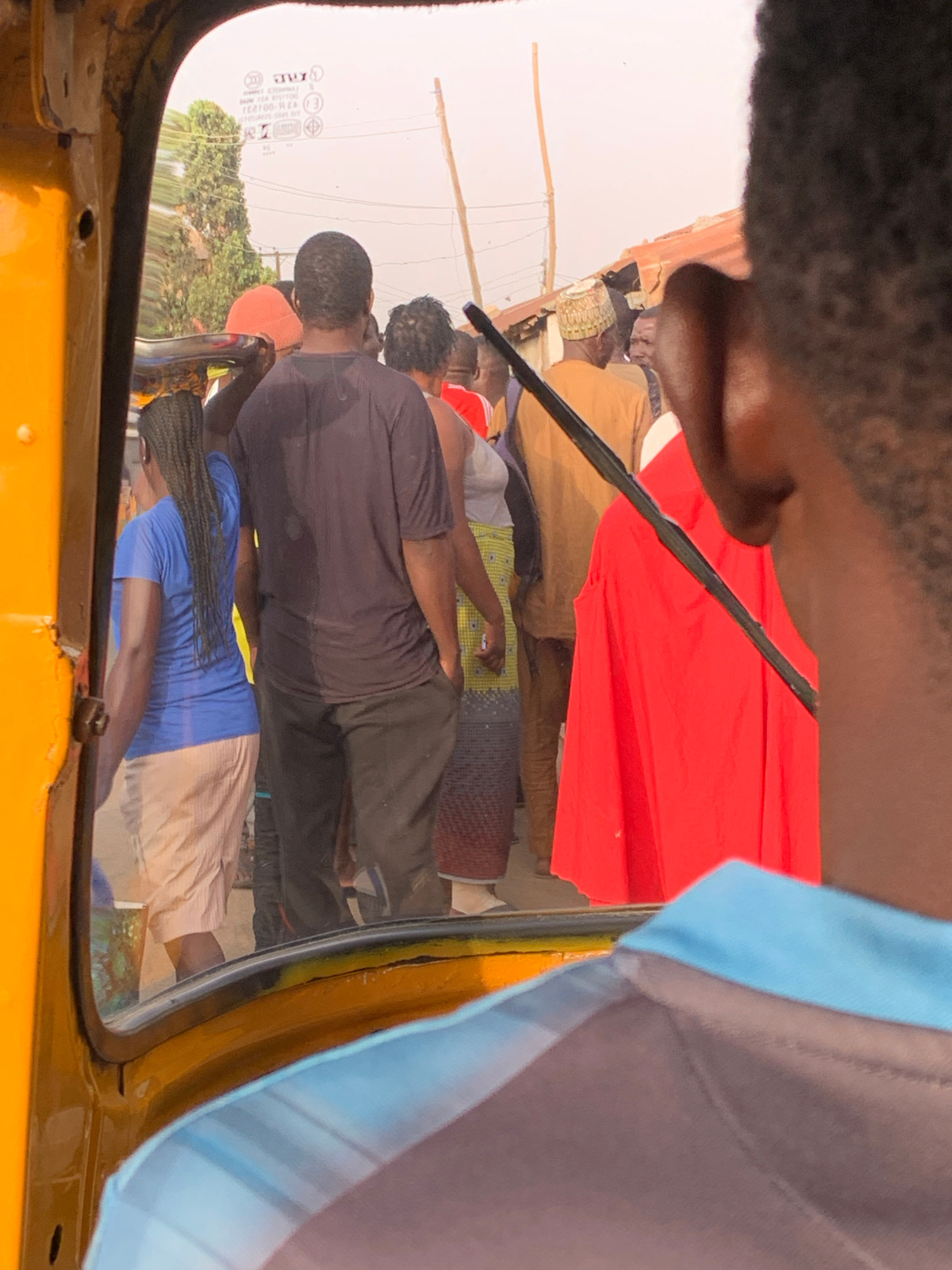 From inside a yellow vehicle, possibly a tuk-tuk, a street scene is visible through the windshield. A group of people are gathered outside, including individuals wearing a red garment, a black shirt,…read more