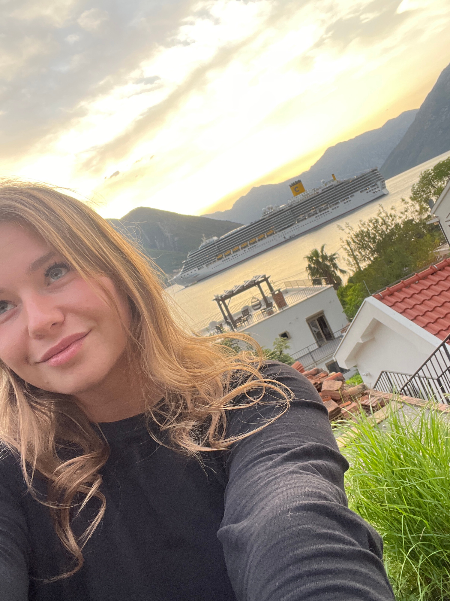 A blonde woman in a black shirt is taking a selfie in Dobrota, Montenegro. The background features a cruise ship docked near the coast, mountains, buildings with orange tiled roofs, and green grass. T…read more