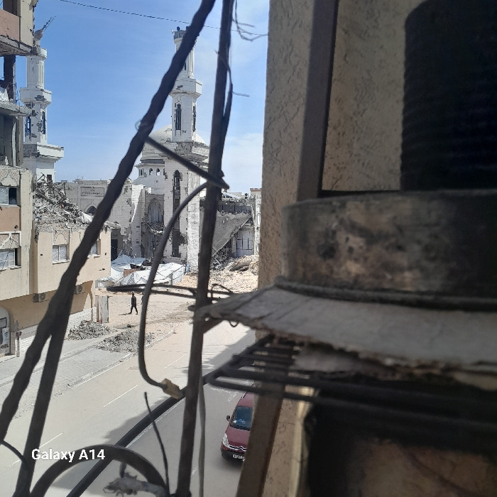 The image depicts a street scene in Khan Yunis, Palestinian Territory, viewed from an elevated perspective, possibly a window or balcony, partially obstructed by a dark, weathered metallic structure i…read more