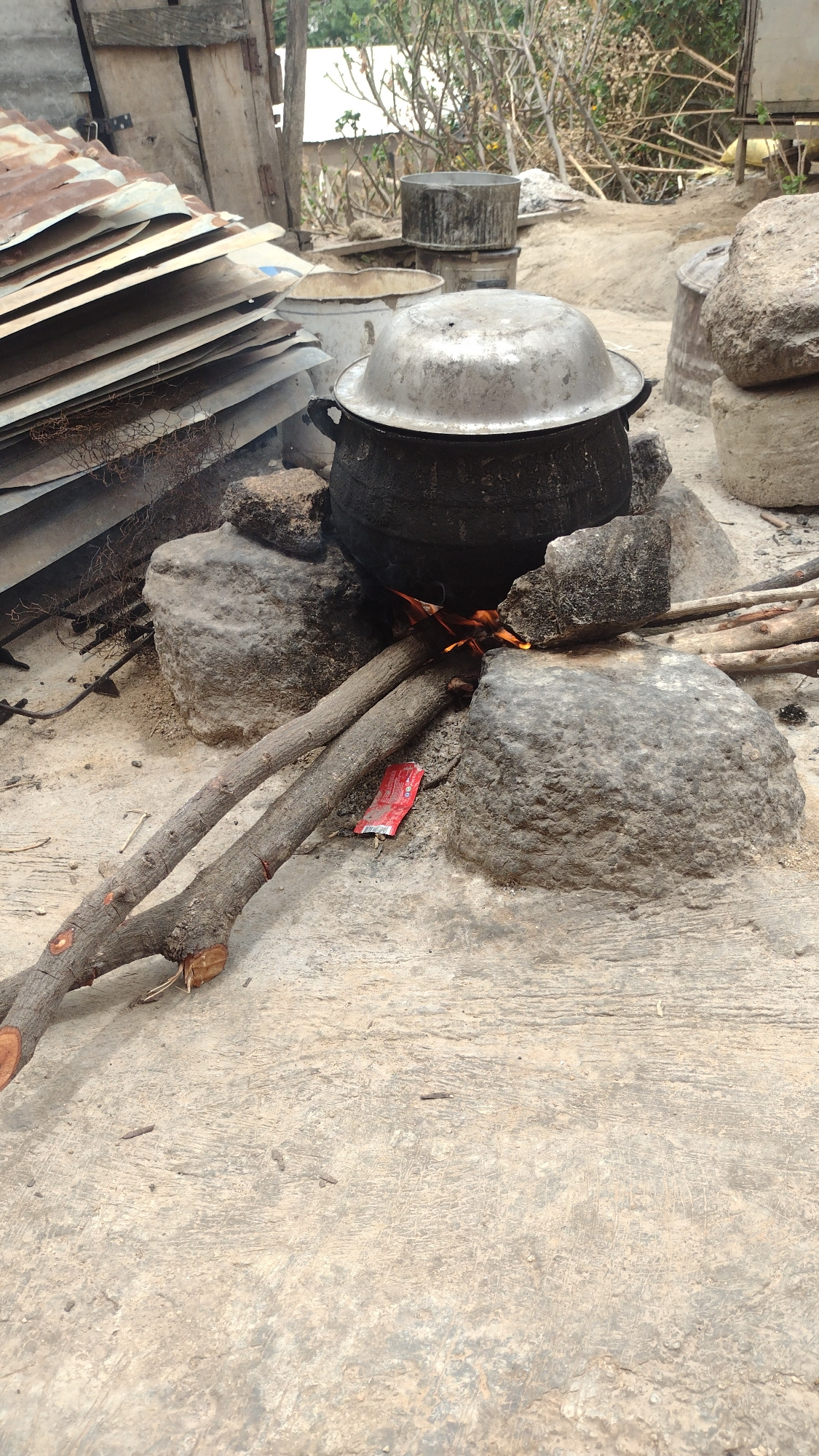 The image depicts an outdoor cooking scene set in what appears to be Jos, Nigeria, during the daytime. A large, dark metal pot with a shiny metallic lid is positioned over an open fire, supported by s…read more
