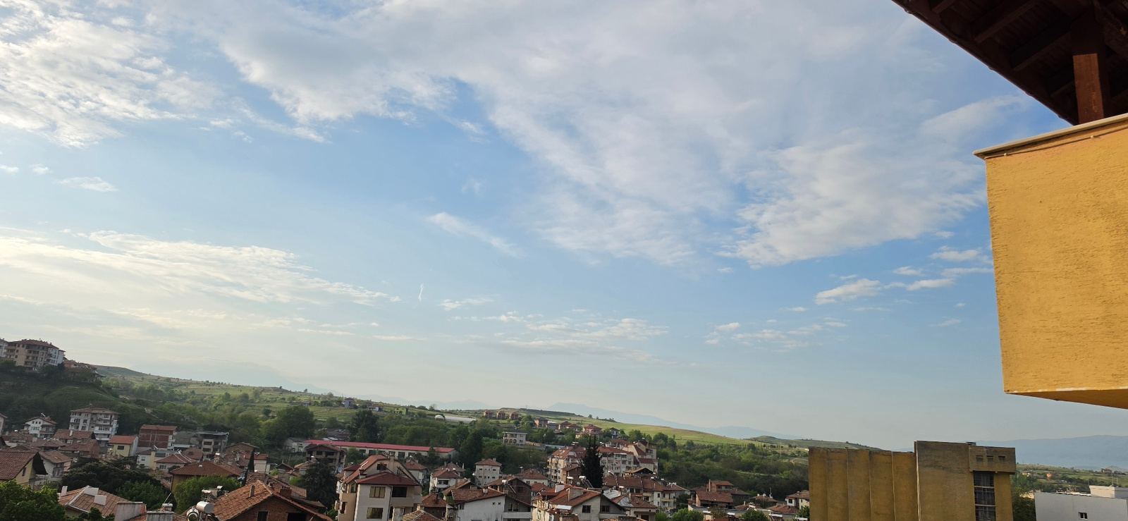 This elevated panoramic view captures a peaceful daytime scene of Sandanski, Bulgaria, nestled within a valley surrounded by rolling green hills and distant mountains. The sky, dominating the upper ha…read more