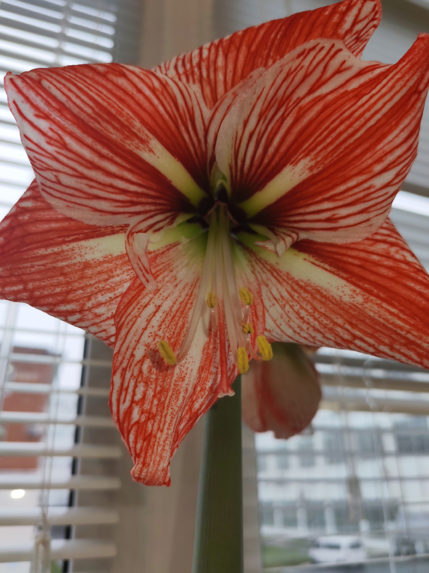 A close-up shot features a vibrant Amaryllis flower with red and white striped petals. The flower's stamen are visible, showcasing yellow pollen. The flower is in bloom, appearing to be indoors, positβ¦read more