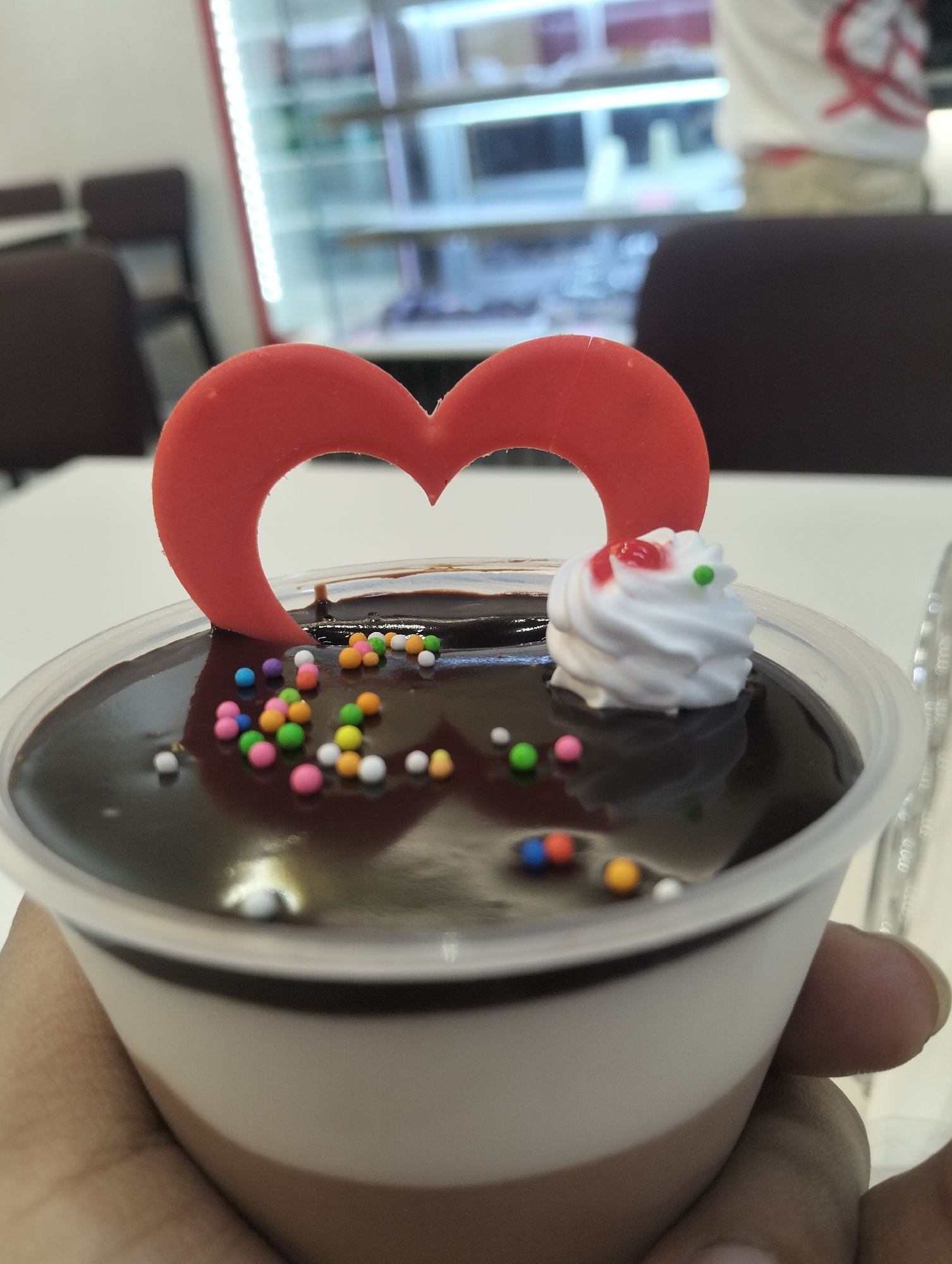 A person holds a clear plastic cup containing a layered dessert. The dessert consists of a bottom layer of brown mousse, a middle layer of light cream, and a top layer of dark chocolate ganache. The d…read more