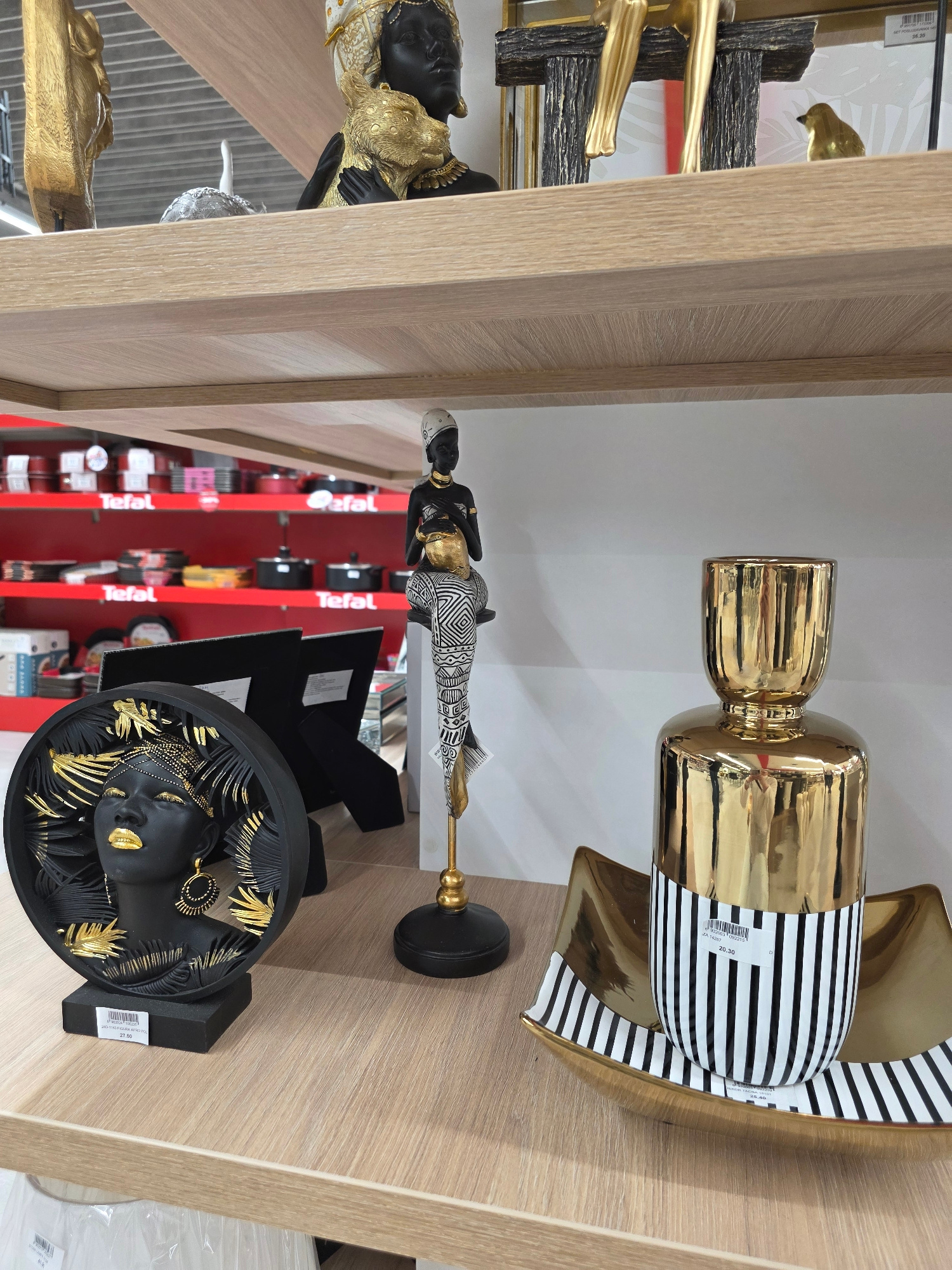 The scene depicts a retail store display shelf in Bjeliši, Montenegro. The primary focus is a light-colored wooden shelf presenting three distinct decorative arrangements. On the left, a black circula…read more