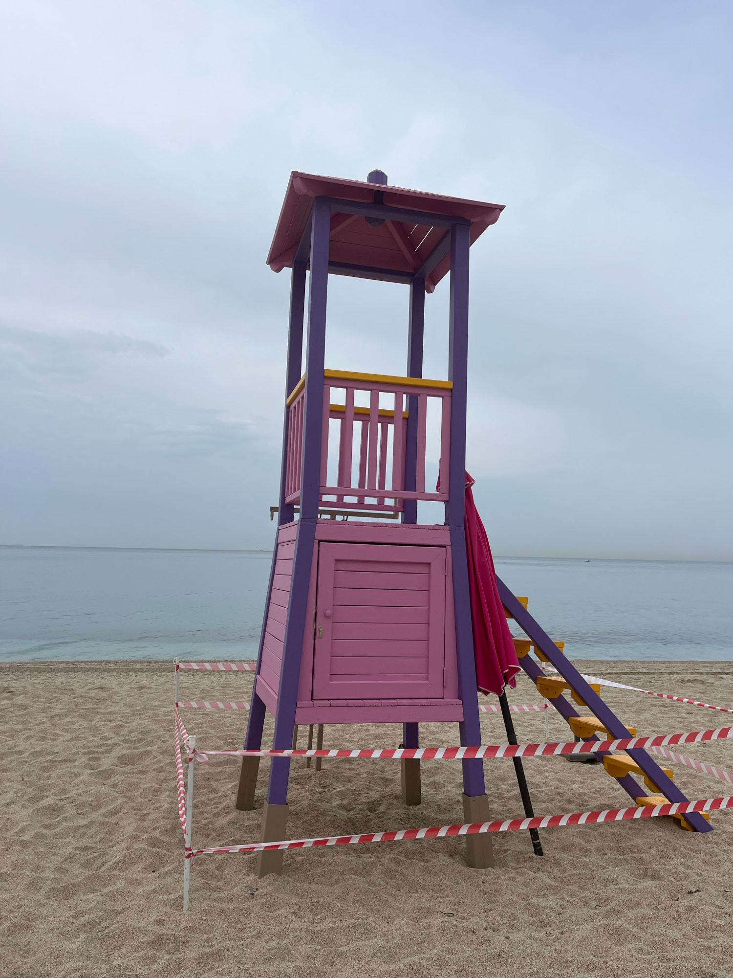 This landscape-oriented image features a vibrant, multi-colored wooden structure positioned on a sandy beach next to the sea. The structure, resembling a lifeguard tower or a beach playhouse, is paint…read more