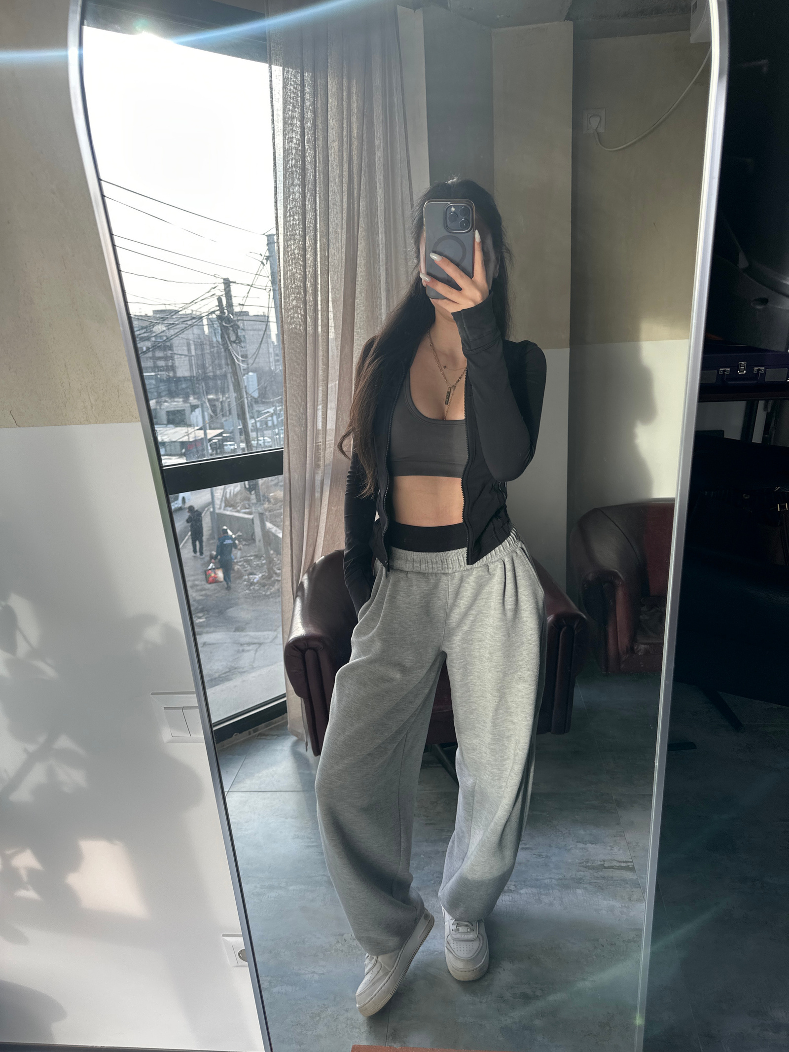 A female individual is depicted indoors, reflected in a full-length mirror, engaged in taking a self-portrait with a dark-colored smartphone that obscures her face. She has long, dark hair and is atti…read more