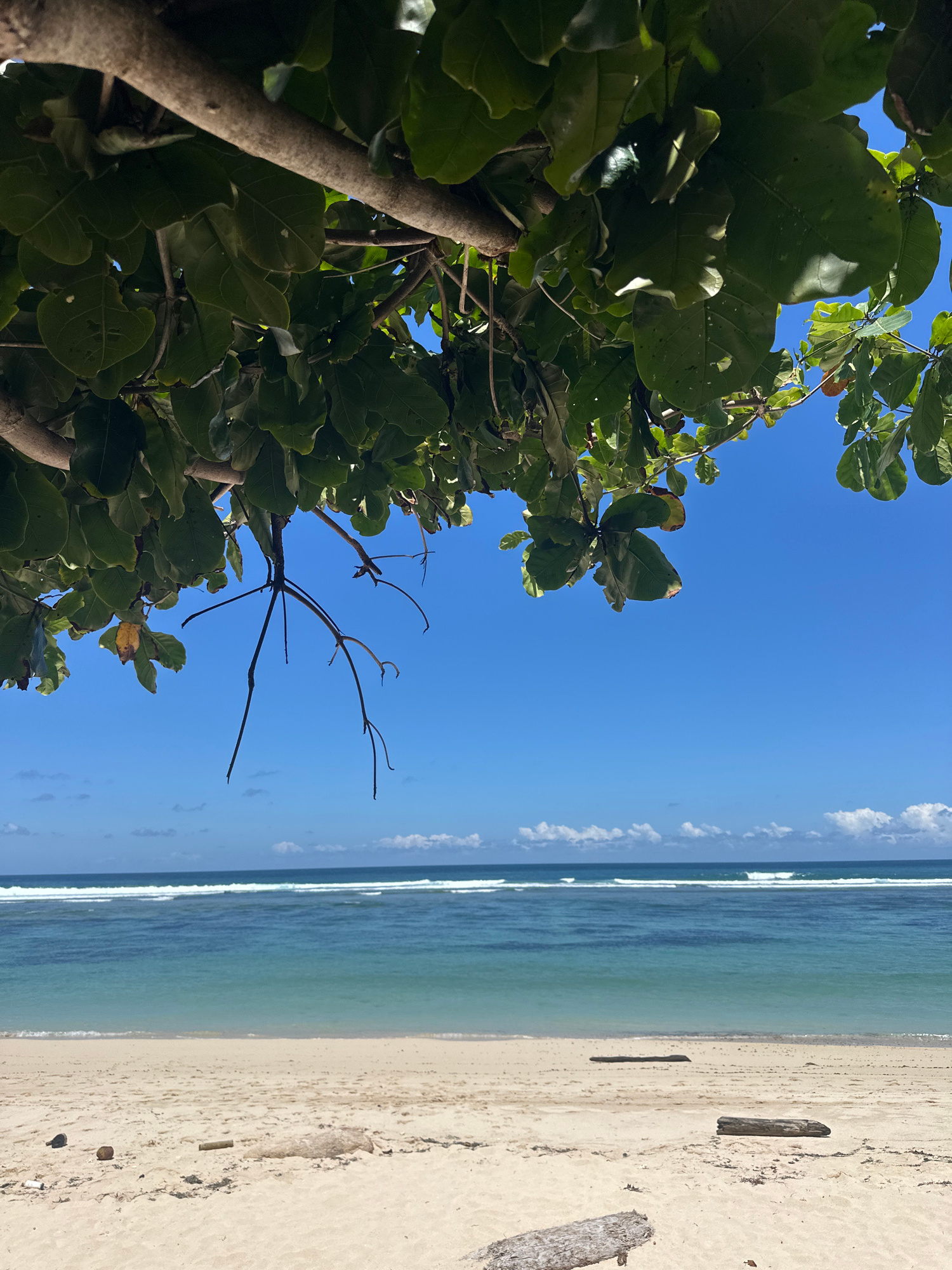 This media file presents a serene, sunny tropical beach scene. The image is composed with a low-angle perspective, looking upwards and outwards towards the ocean. In the foreground, occupying the lef…read more