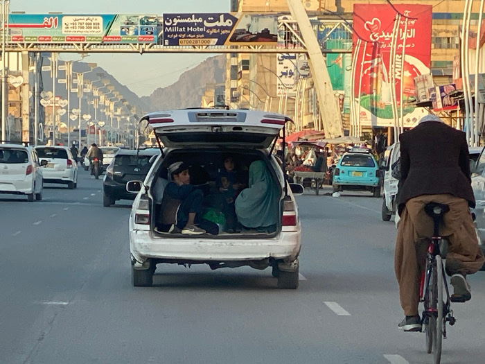 This image depicts a daytime urban street scene in Kandahar, Afghanistan, characterized by moderate vehicular and pedestrian traffic. In the immediate foreground, a male cyclist, viewed from behind,…read more