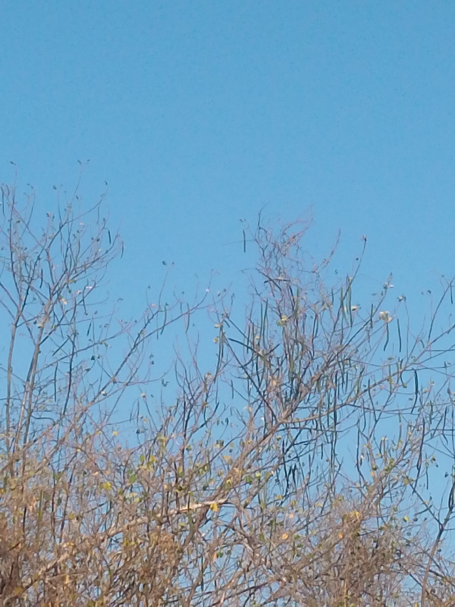 The image shows a tree with a mix of bare branches, sparse green leaves, and hanging seed pods against a clear blue sky. The tree appears to be at the end of its growing season or during a dry period.…read more