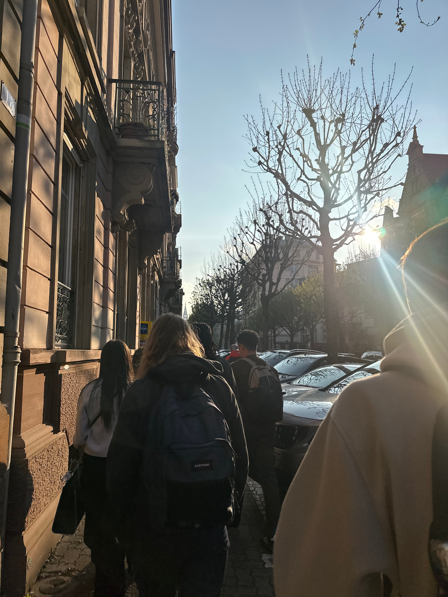 A street scene in Strasbourg, France, shows a line of people walking along the sidewalk, with their backs to the camera. The group consists of various individuals wearing backpacks and casual clothing…read more