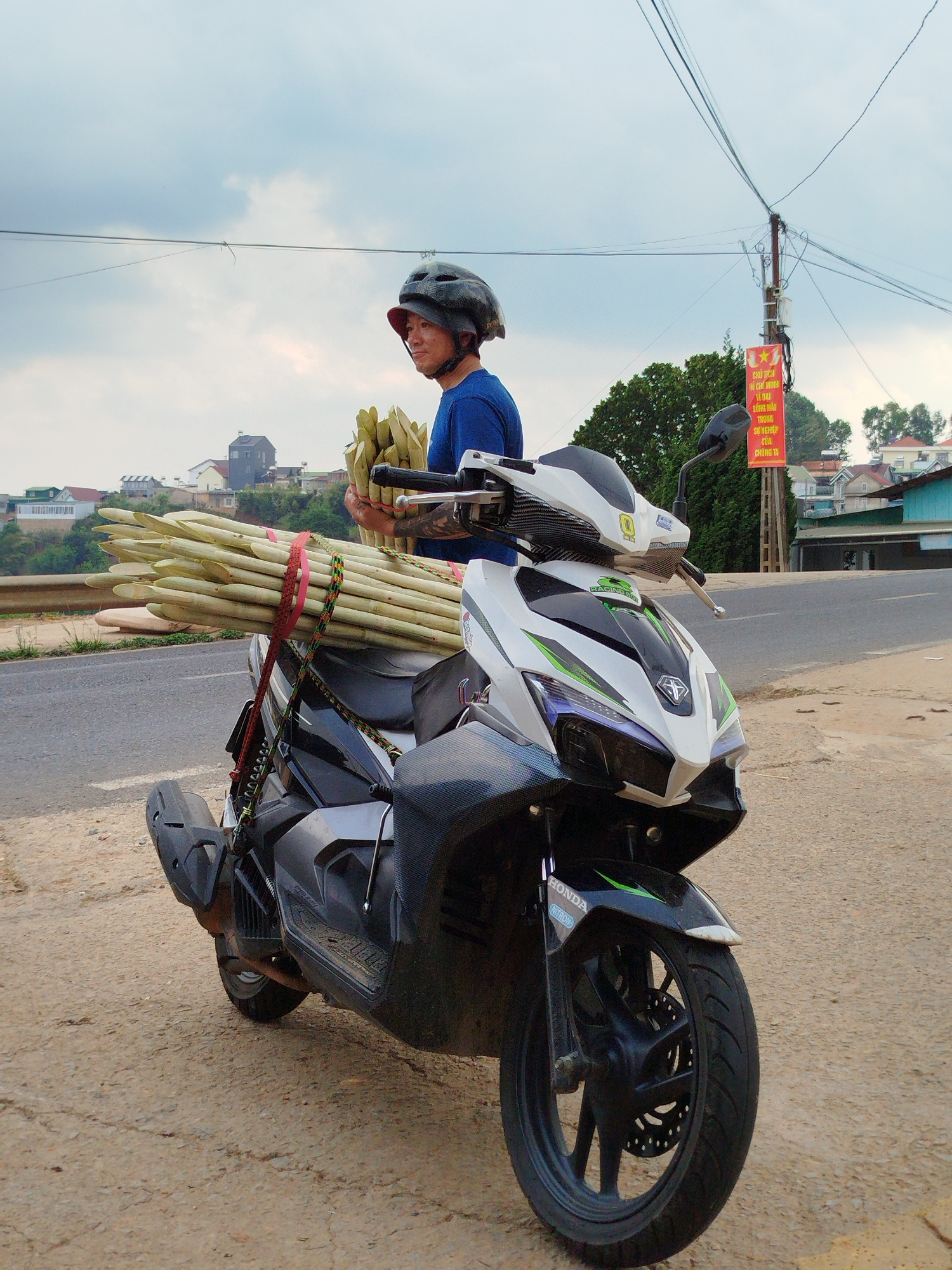 A man wearing a helmet rides a Honda motorcycle along the shoulder of a road in Đa Thọ, Vietnam. The motorcycle is black and white, with green trim. The man wears a blue shirt and carries two bundles of green-yellow bamboo stalks in front of him. The bundles are secured with red ties. The road behind the motorcycle is grey and slopes downwards. In the background are houses and trees against a cloudy sky. A utility pole with a red and yellow banner is visible. The banner has black writing and a gold star. | Open Wire