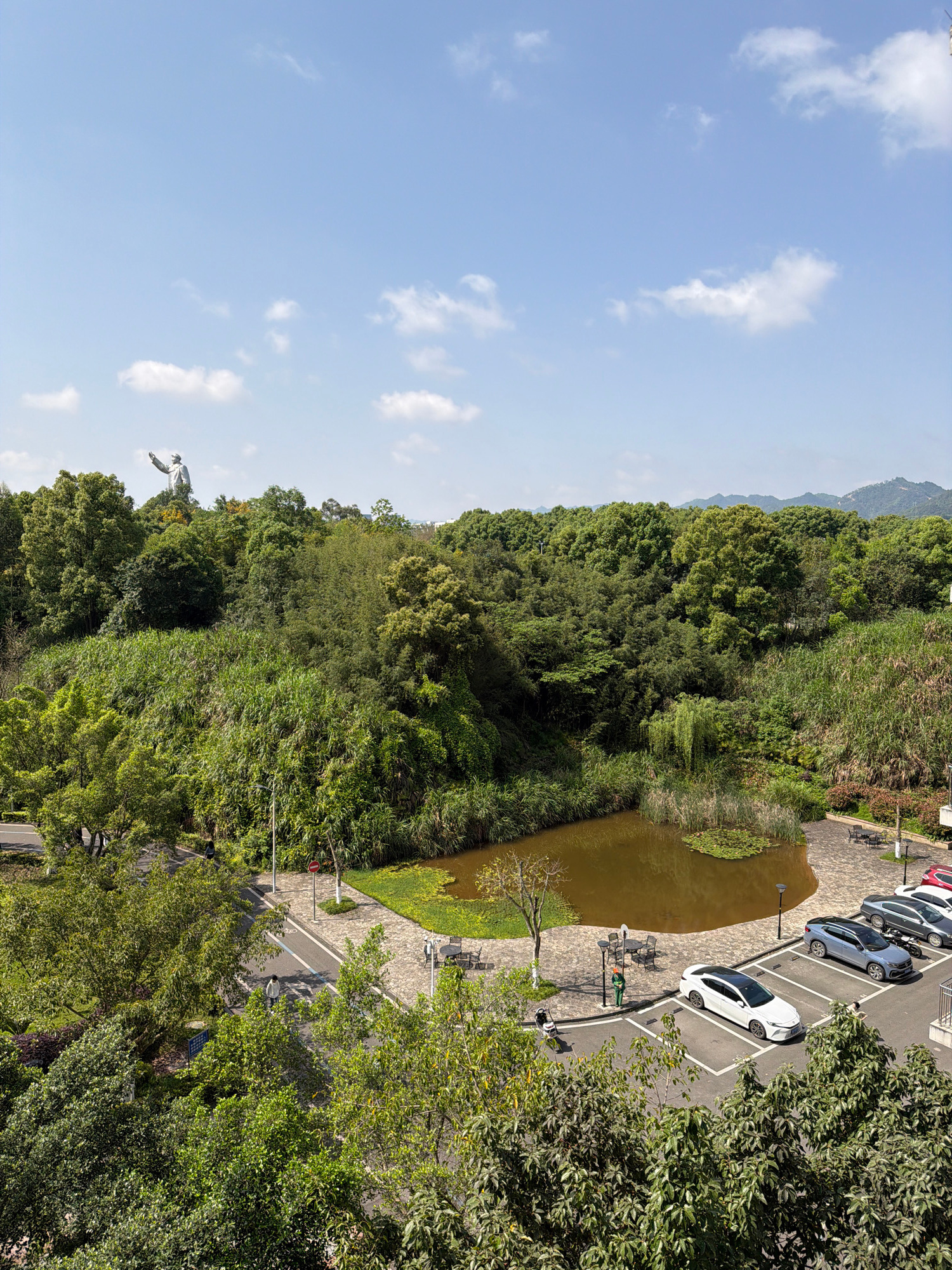 This image, captured from an elevated viewpoint, depicts a bright, sunny daytime scene in the Chongqing High-tech Zone, China. The sky is a clear blue with scattered white clouds. The scene is a mix…read more