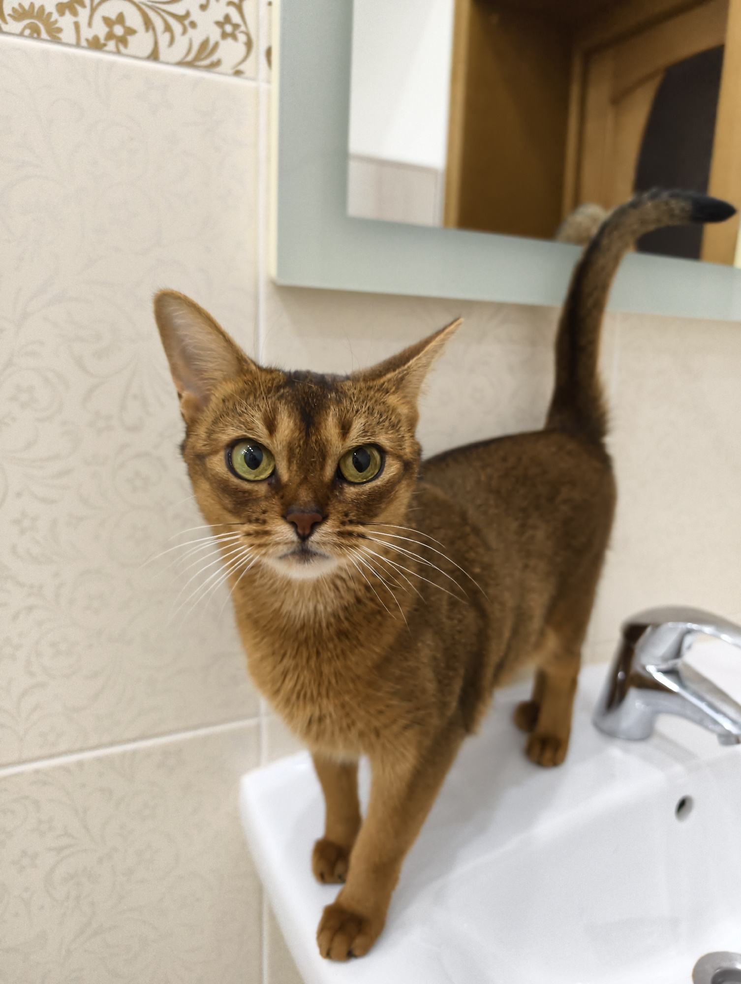 A domestic cat, likely an Abyssinian due to its distinctive ticked, reddish-brown fur, stands on the edge of a white bathroom sink in Kolosisty, Russia. The cat is the central subject, captured in a c…read more