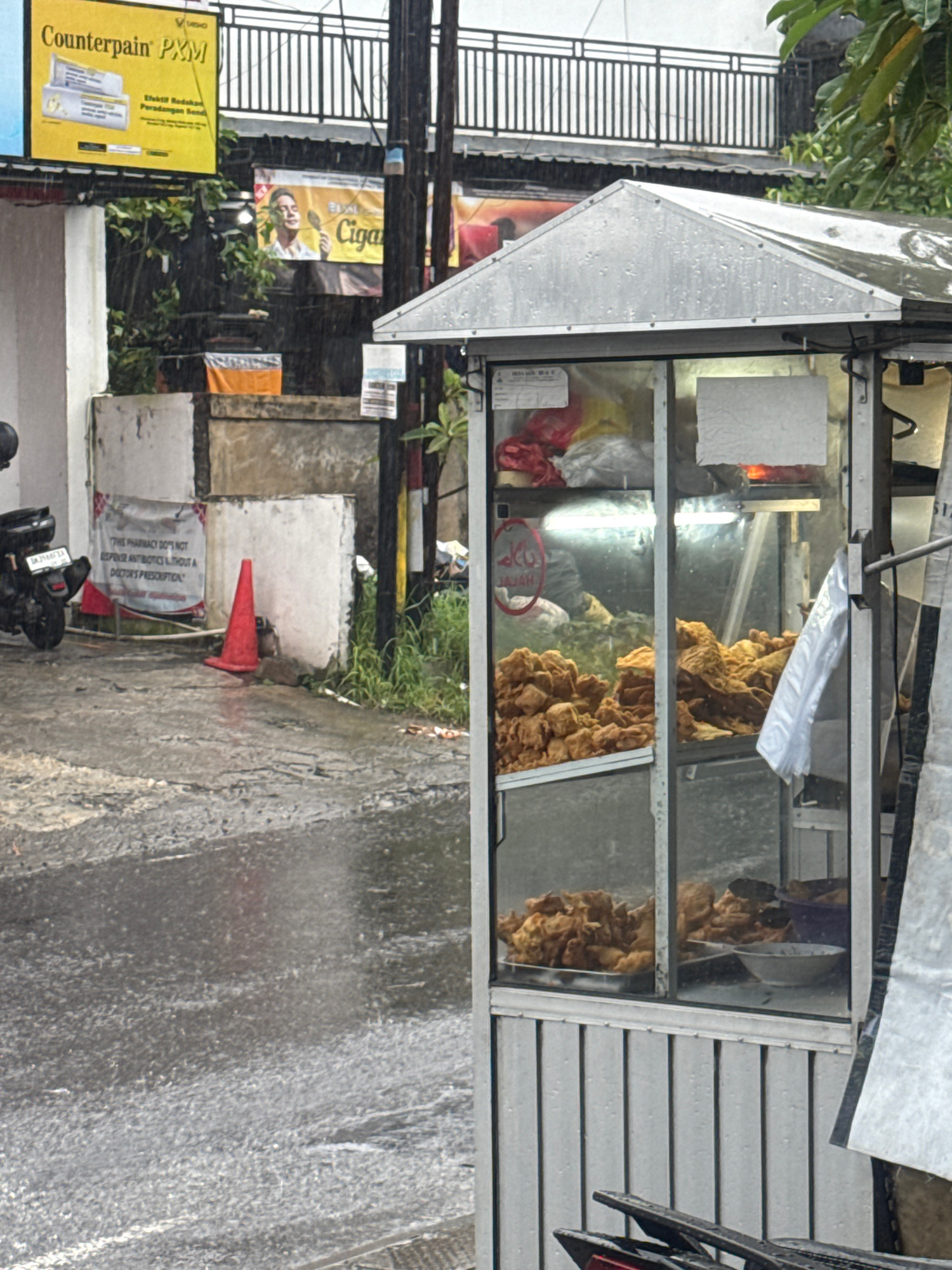 The image captures an outdoor street scene in Kuta Selatan, Indonesia, during what appears to be a rainy day, evidenced by the wet ground and visible water streaks. The photograph is oriented vertical…read more