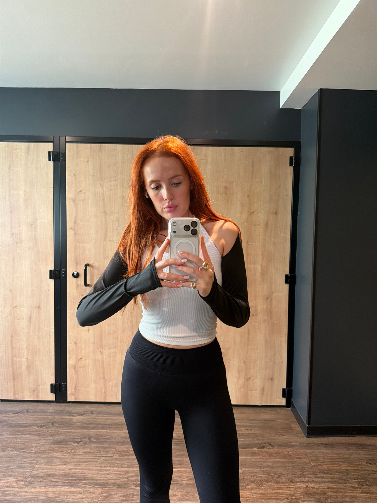 A young woman is taking a selfie in what appears to be an indoor setting. She has long, red hair and is wearing a white tank top with black sleeves and black leggings. She is holding a phone in her ha…read more