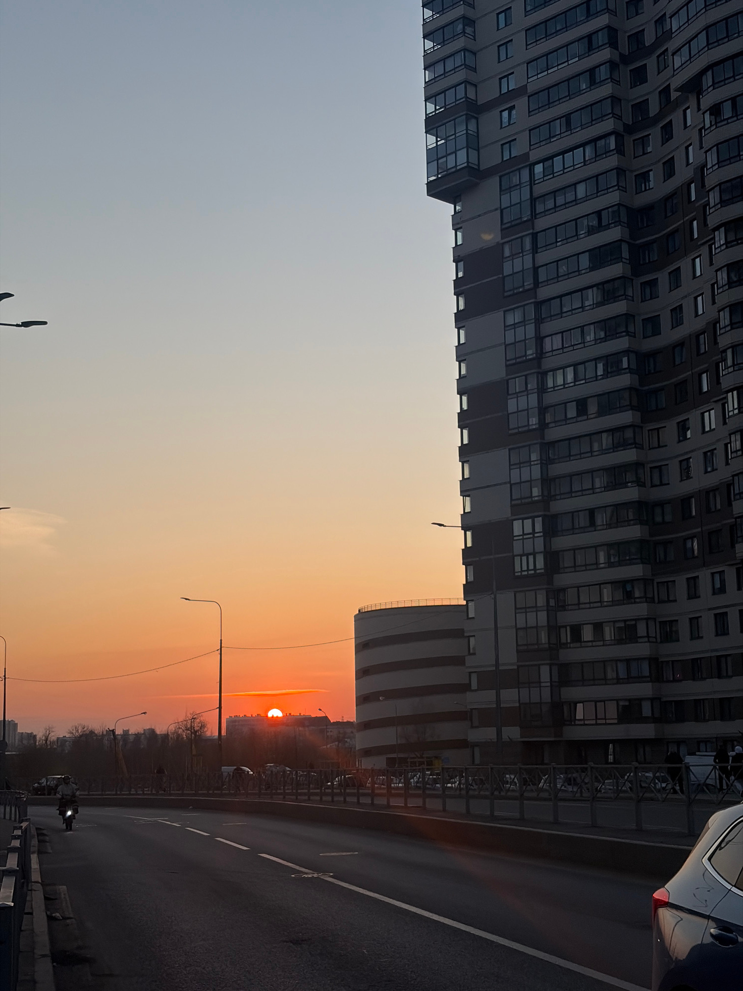 The image shows a sunset in what appears to be an urban setting. A tall residential or office building is on the left side, while a highway or wide road runs along the right. The sun is setting on the…read more