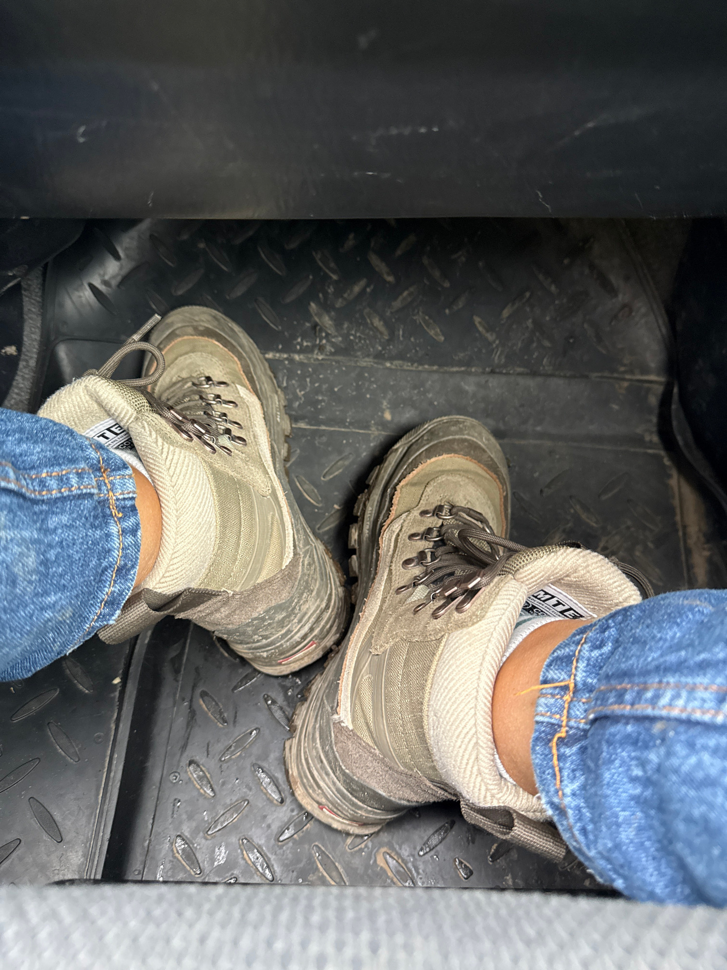 The image shows a pair of worn hiking boots on a black rubber mat with a diamond pattern. The boots are laced and appear to be made of a light-colored canvas material with darker trim. A person wearin…read more
