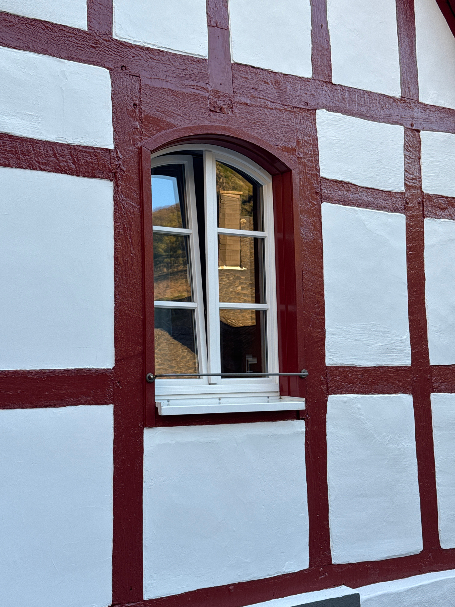 A low-angle, medium shot depicts a section of a building with a half-timbered (Fachwerkhaus) design, typical of architecture in Beilstein, Germany. The structure features a grid of dark red, roughly h…read more
