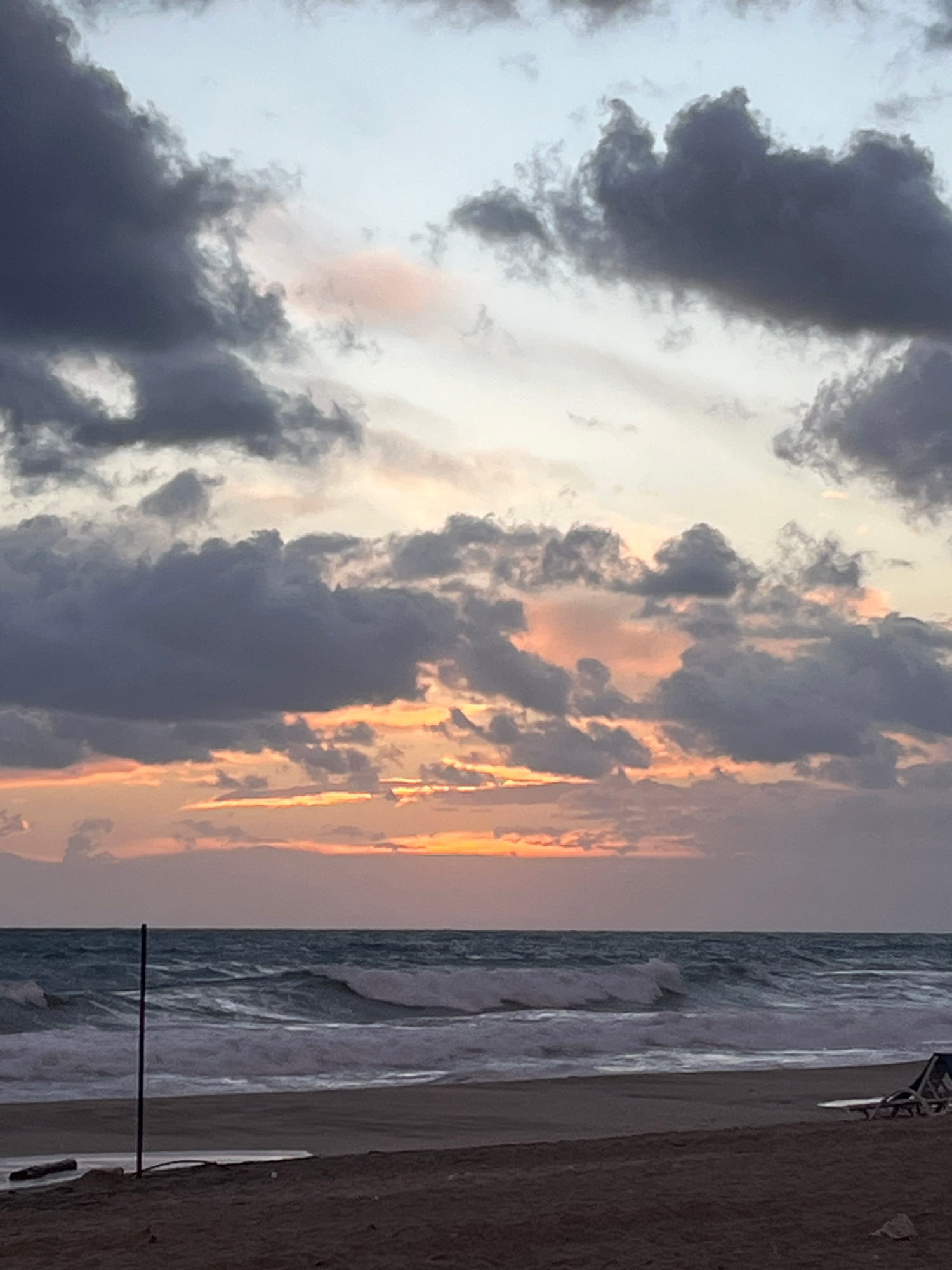 The photograph depicts a coastal scene in Alanya, Turkey, likely taken during either sunrise or sunset. The sky is filled with dark, ominous clouds intermixed with lighter, brighter areas, some tinted…read more