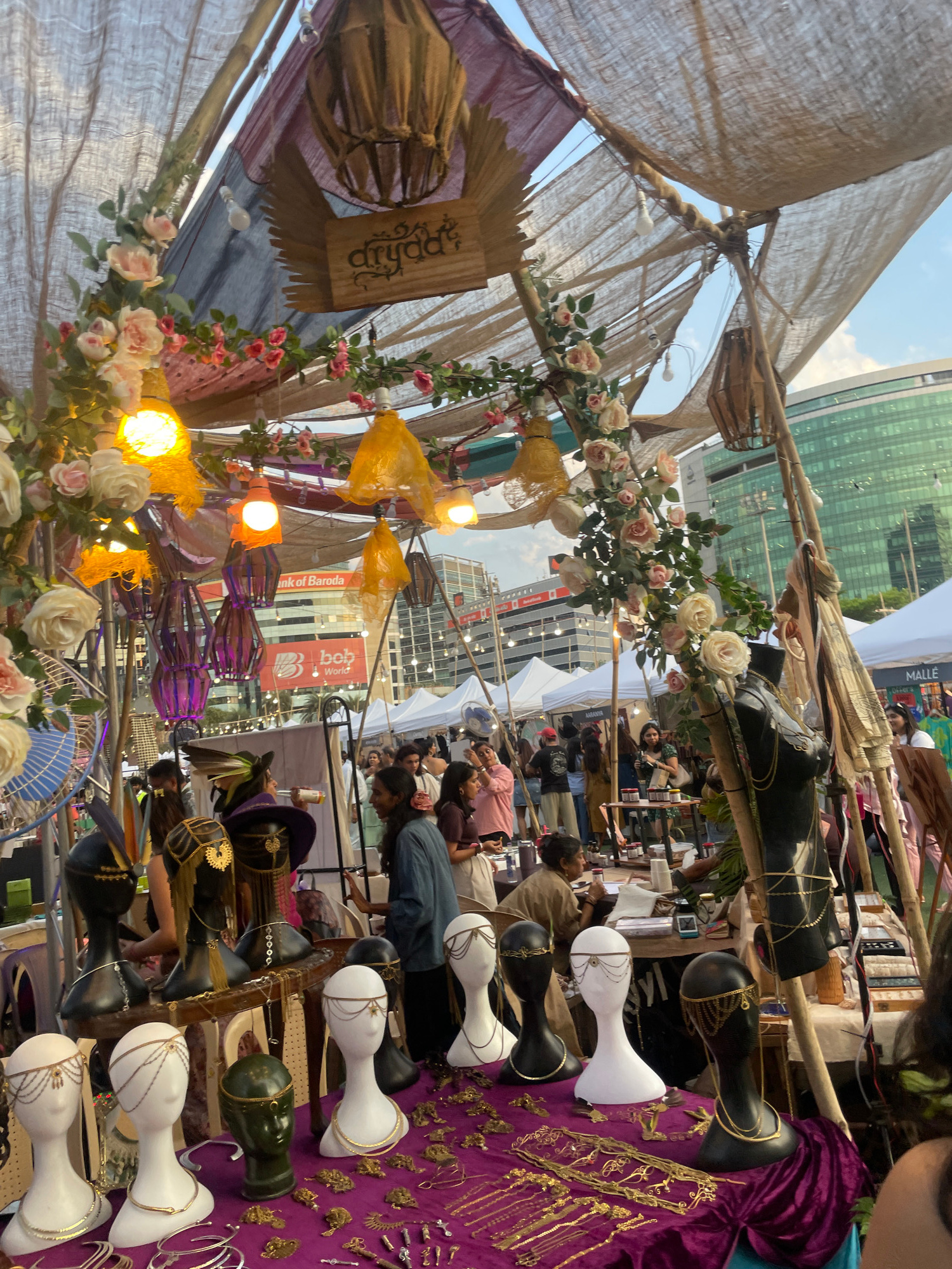 This image shows a vendor stall at an outdoor market in Mumbai, India. The stall is covered with a burlap roof adorned with flowers and decorative lights. A wooden sign with "drydaa?" is hung on the l…read more