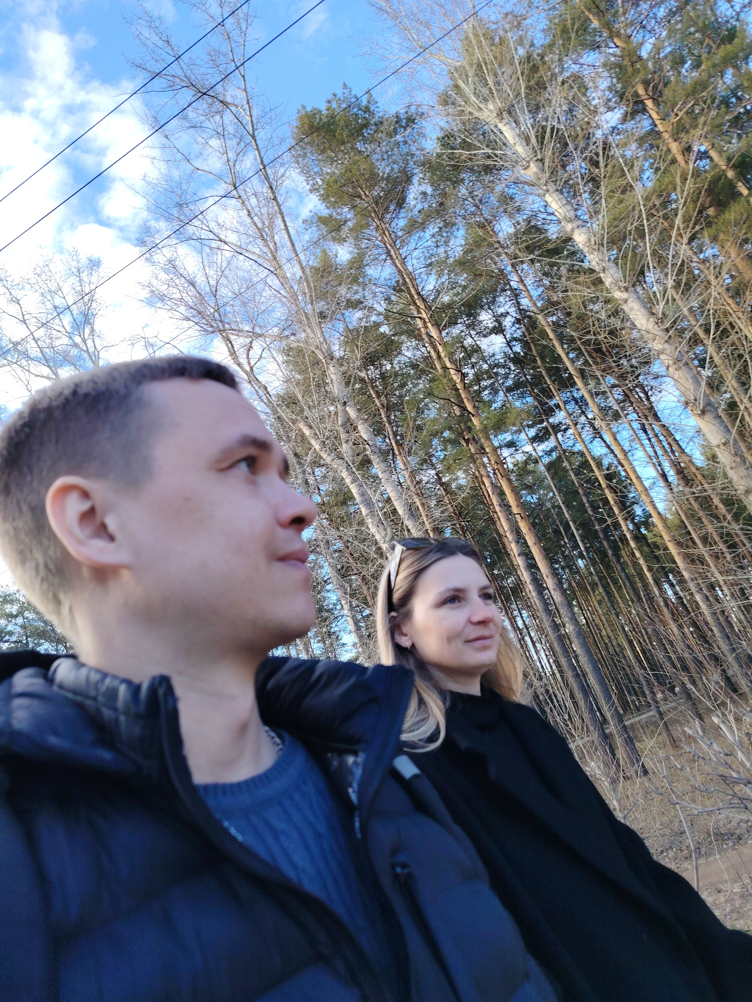 A photograph taken in Chaikovsky, Russia, shows two individuals, a man and a woman, standing outdoors in what appears to be a wooded area on a sunny day. The man is on the left, wearing a navy blue pu…read more