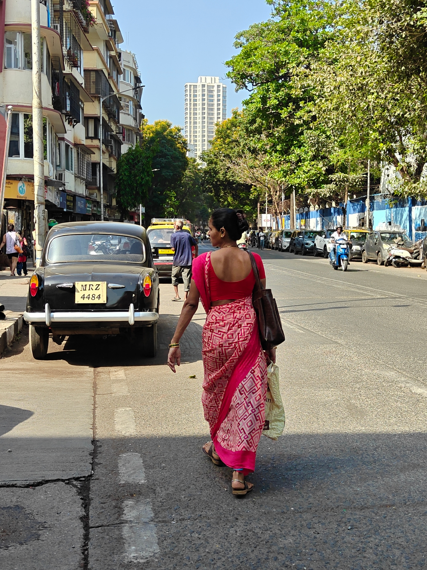 A woman wearing a pink sari walks on the left side of a road in Mumbai, India, away from the viewer. She carries a brown leather bag on her left shoulder. To her left, a black vintage car is parked, iβ¦read more