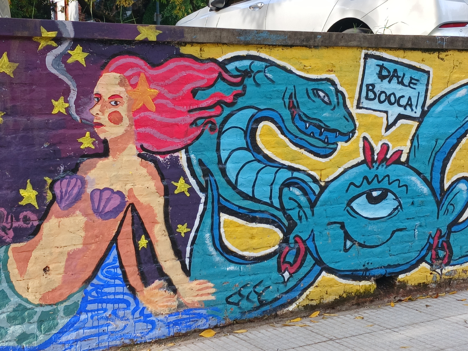 A vibrant mural adorns a brick wall in Buenos Aires, Argentina. On the left, a mermaid with red hair and a starfish in her hair is depicted smoking. Her skin is yellowish-orange, and she wears purple…read more