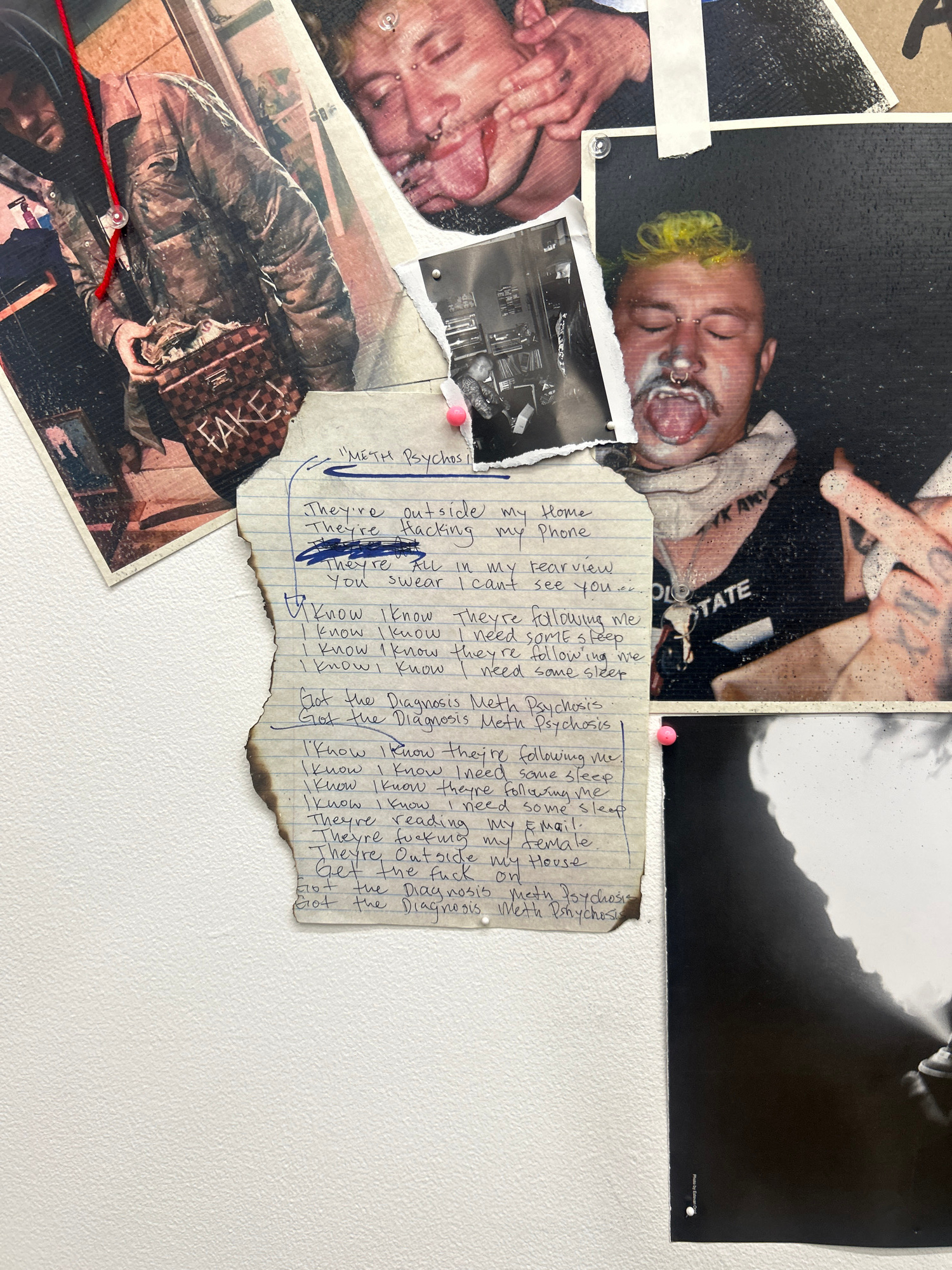 The image is a close-up of a collage or mood board, likely on a wall. It features an assortment of photographs and a handwritten note pinned to the surface. Photographs: * Several images of a perso…read more