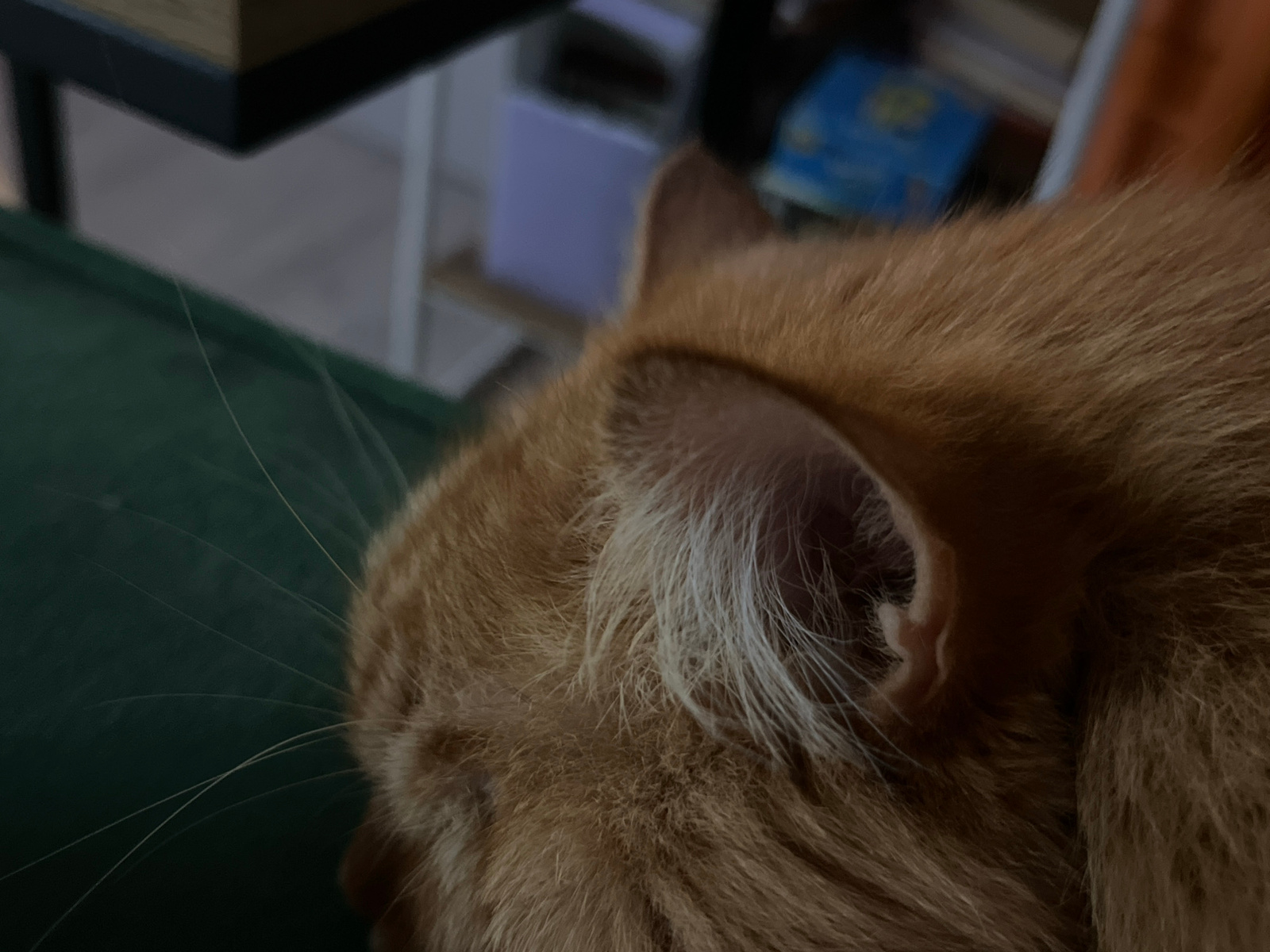The image provides a very close-up, high-angle perspective of an orange or ginger cat's head, predominantly featuring its right ear and the surrounding fur. The cat's fur is a rich reddish-brown, with…read more