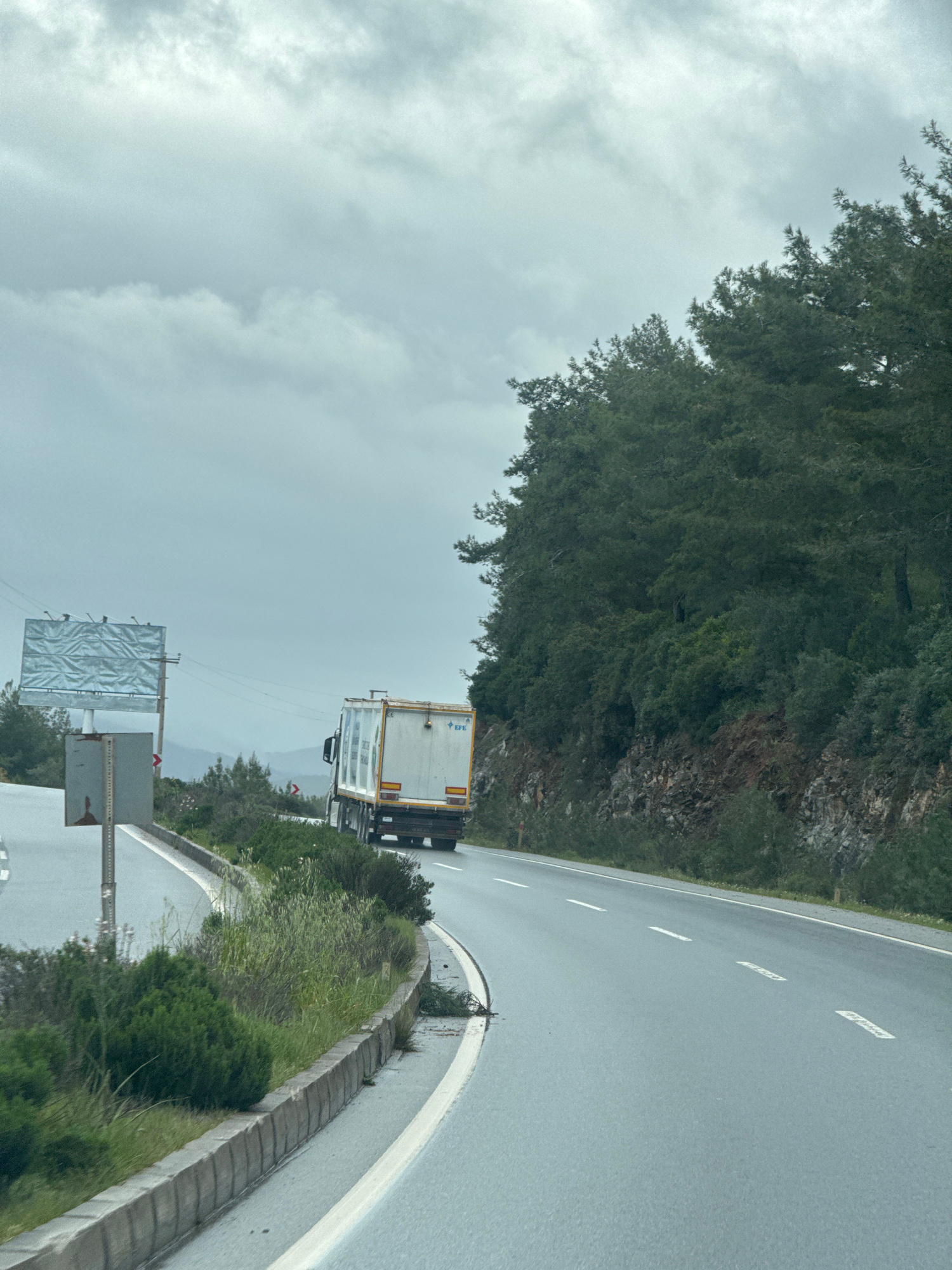 The image captures a view from a vehicle traveling on a highway in Bodrum, Turkey. The sky is overcast. To the right, the highway curves gently, marked with white lane dividers and a concrete barrier…read more