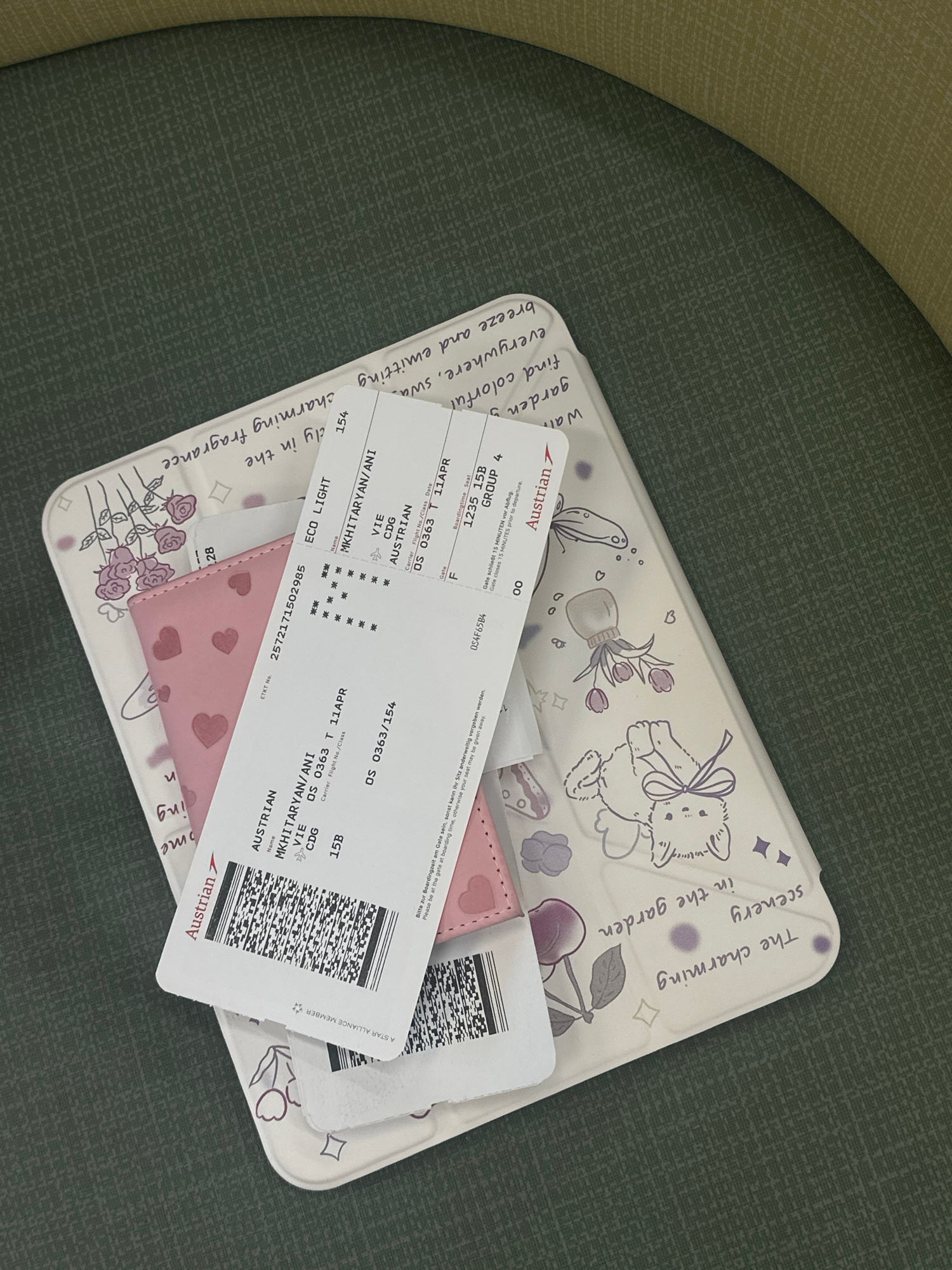 The scene is indoors, likely on a green patterned chair or seating surface. An Austrian Airlines boarding pass with the name "MKHITARYAN/ANI," flight number "OS 0363 T," destination "VIE CDG," and sea…read more