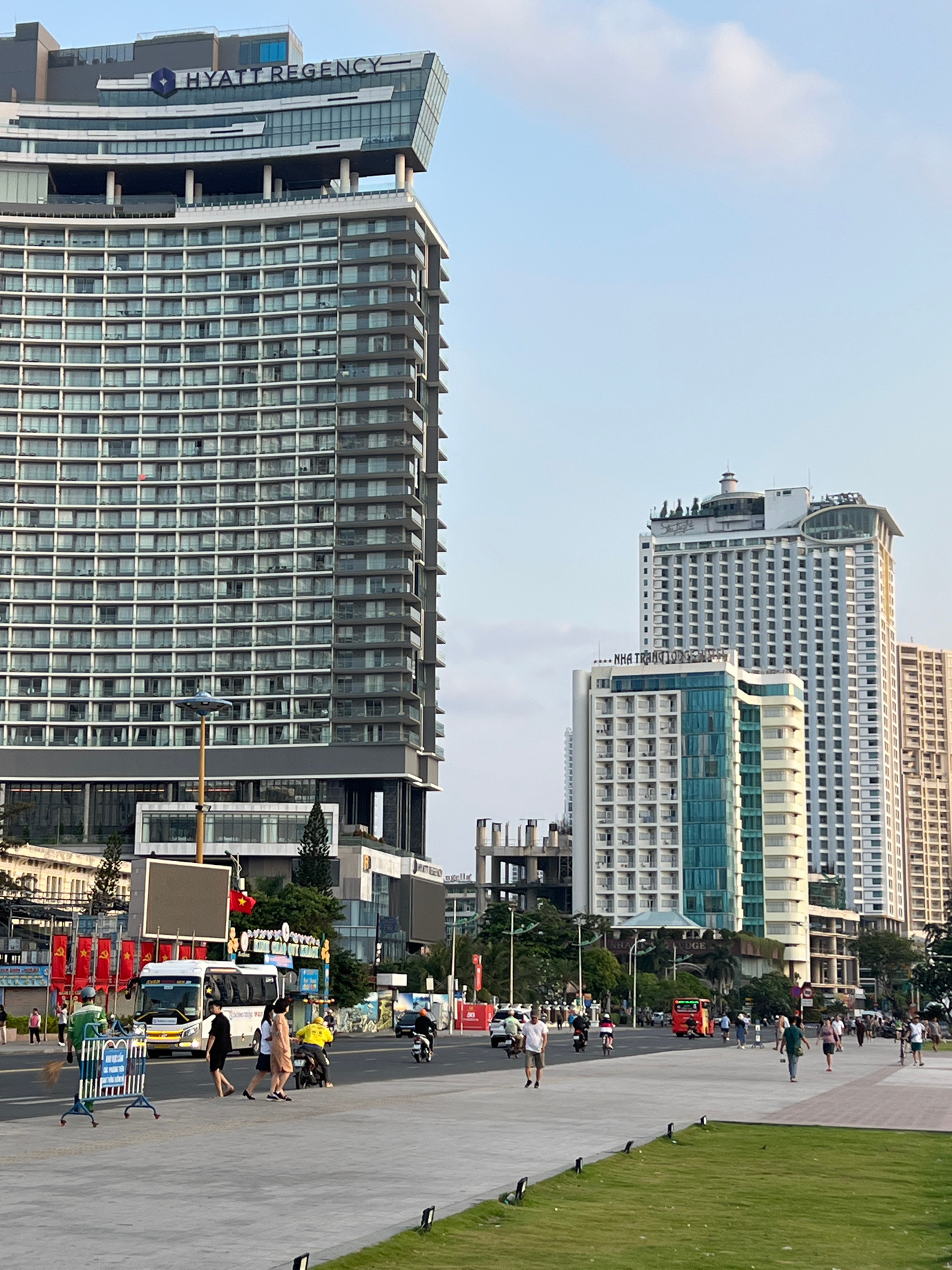 The image shows a street scene in Nha Trang, Vietnam, with a view of the coastline. In the foreground stands the Hyatt Regency Nha Trang, a tall modern hotel with a glass and steel facade. Adjacent to…read more