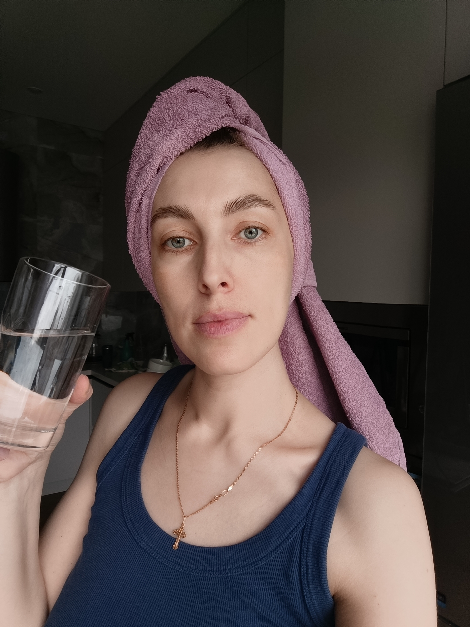 A fair-skinned woman with light blue eyes and a light pink towel wrapped around her head is holding a glass of water in her left hand. She is wearing a dark blue ribbed tank top and a gold necklace wi…read more