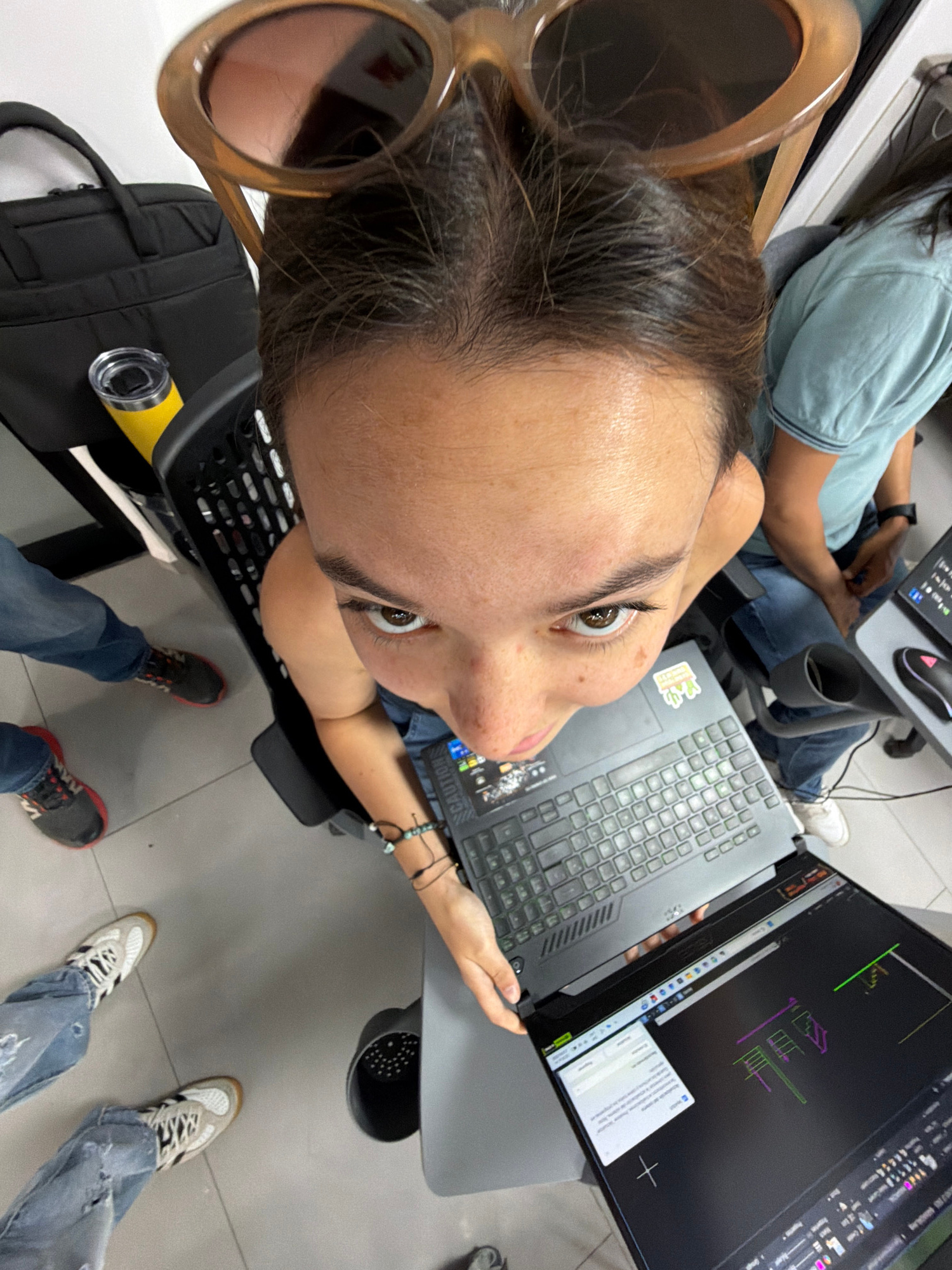 An eye-level, aerial shot depicts a woman holding a laptop in a room. She has light skin, brown hair, and wears large, round sunglasses. Her torso is visible, clad in a blue shirt. She's seated in a b…read more
