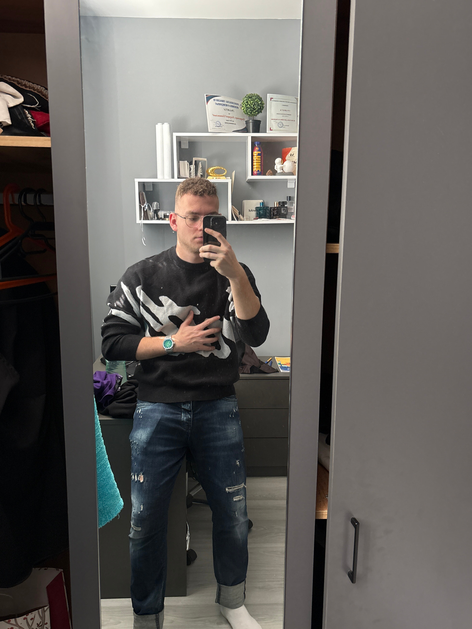 A person stands facing left in a mirror's reflection. The person has short blonde hair and wears glasses. The person is holding a phone to take a picture of themselves. The person wears a dark sweater…read more