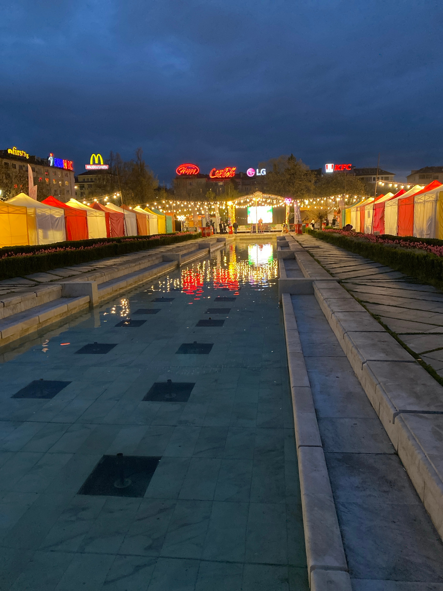 At dusk, a long water feature, possibly a reflecting pool or fountain, occupies the foreground. Its surface reflects the illuminated structures lining the opposite side. These buildings display promin…read more